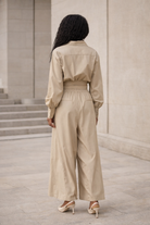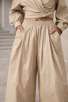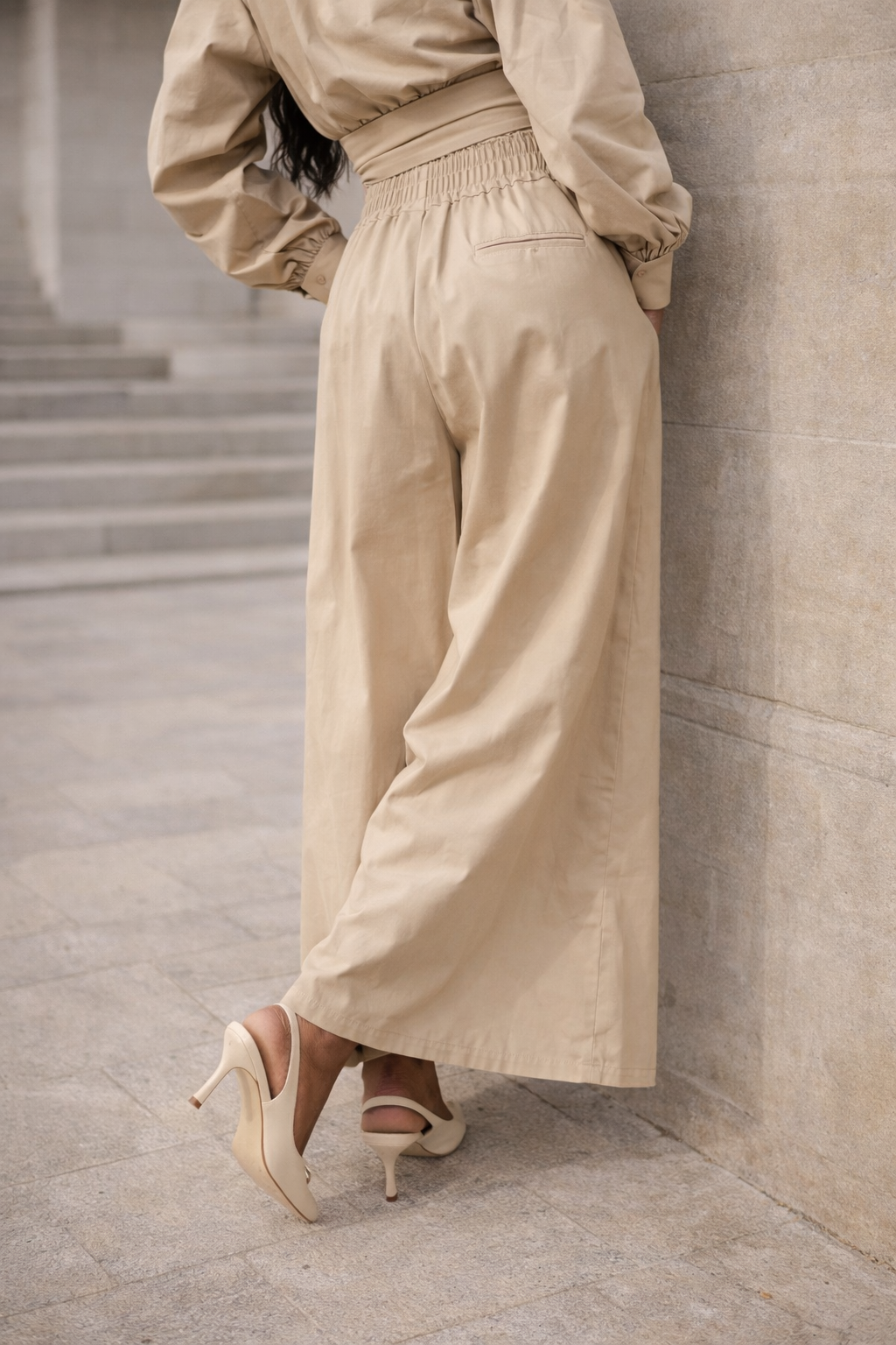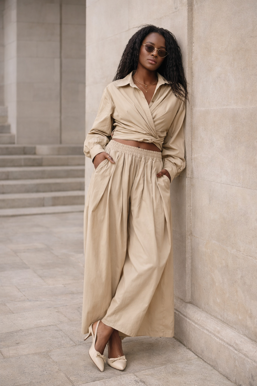 Le pantalon Yara beige sable mise sur le volume et la fluidité pour créer une silhouette forte, élégante et contemporaine. Sa taille haute et sa coupe très large allongent la ligne, tandis que les plis à l’avant structurent subtilement le tombé.