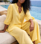 Ce chemisier jaune se porte aussi bien avec un pantalon fluide assorti pour un total look lumineux qu’avec un denim clair, un pantalon blanc ou une jupe naturelle. Il accompagne facilement un look de journée, une silhouette de vacances chic ou une tenue casual élégante.