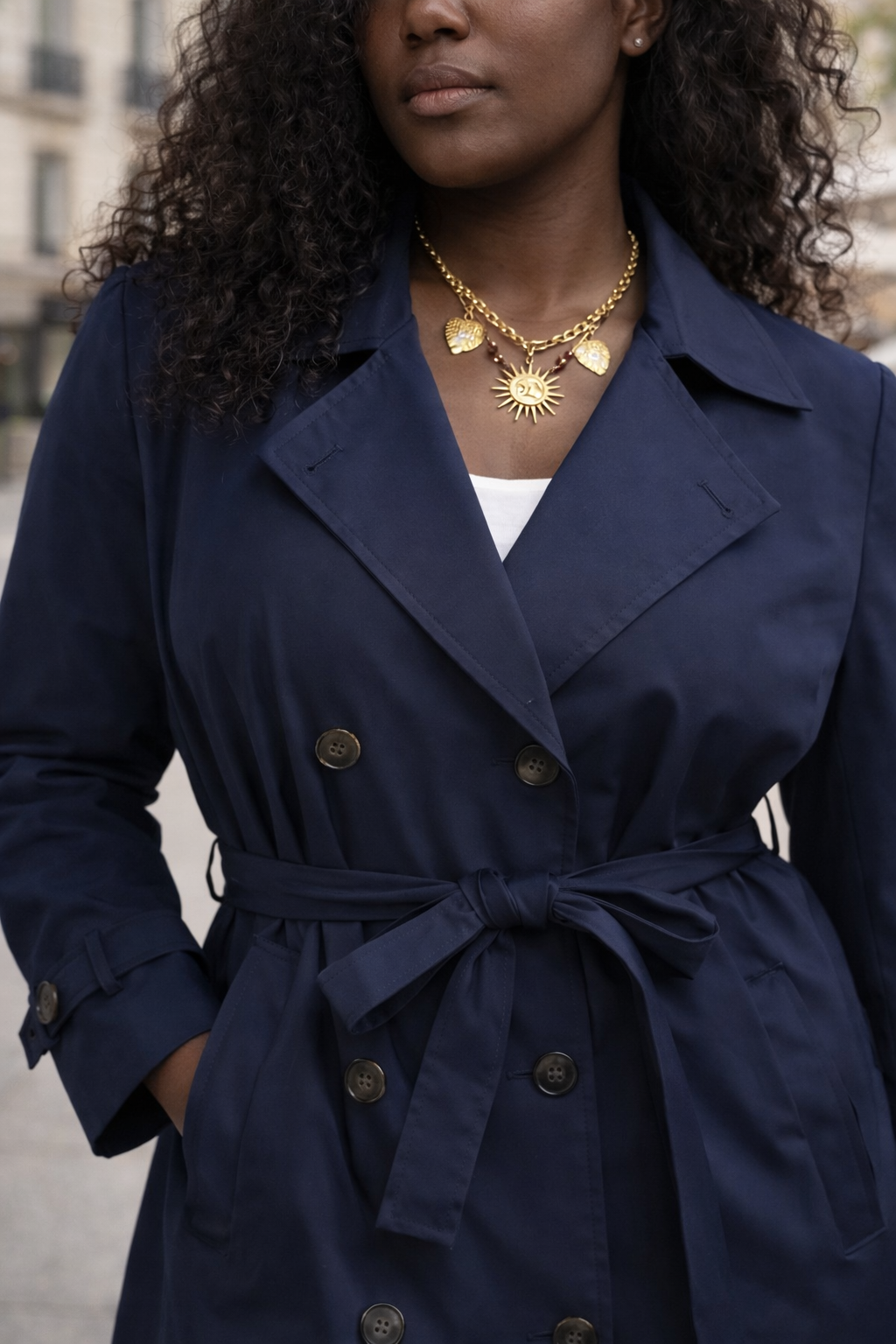 Pensé pour la mi-saison, ce trench femme bleu marine se porte facilement ouvert sur un jean et un top, ou ceinturé sur une robe ou un pantalon habillé. Son tombé légèrement ample assure confort et modernité, avec une allure raffinée facile à intégrer dans un vestiaire casual chic.