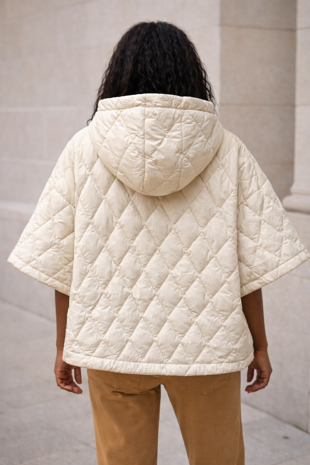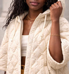Détails visibles : matelassage vertical, capuche intégrée, cordons de serrage, manches larges, bas resserré