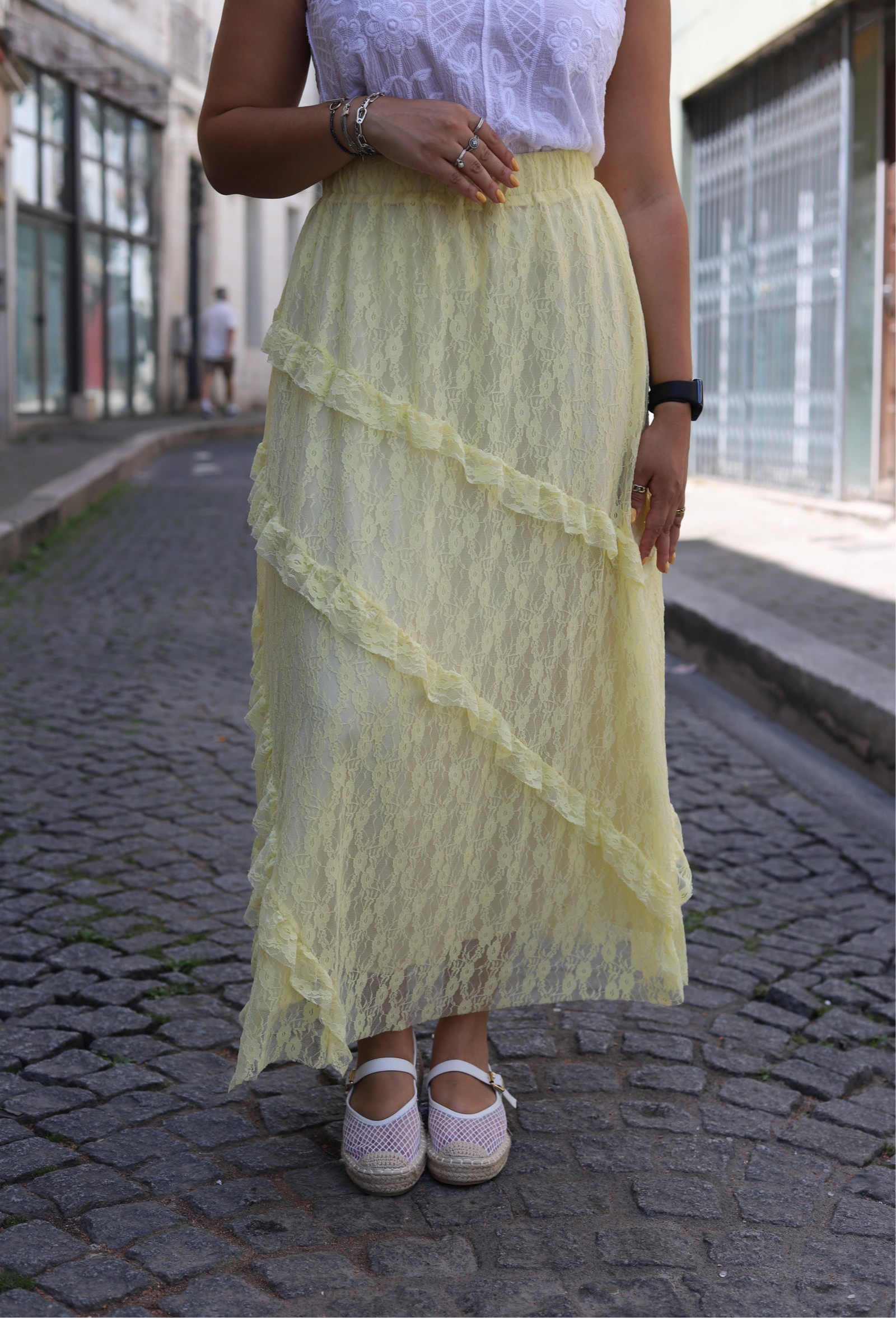 Jupe longue en dentelle jaune à volants – Élégance estivale assurée