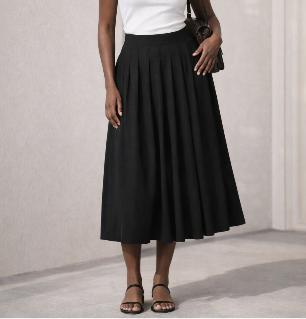 Intemporelle et élégante, cette jupe longue plissée noire s’impose comme un essentiel du vestiaire féminin. Sa ligne fluide accompagne naturellement le mouvement, tandis que son tombé souple crée une silhouette raffinée, facile à porter au quotidien comme dans une allure plus habillée.