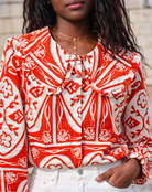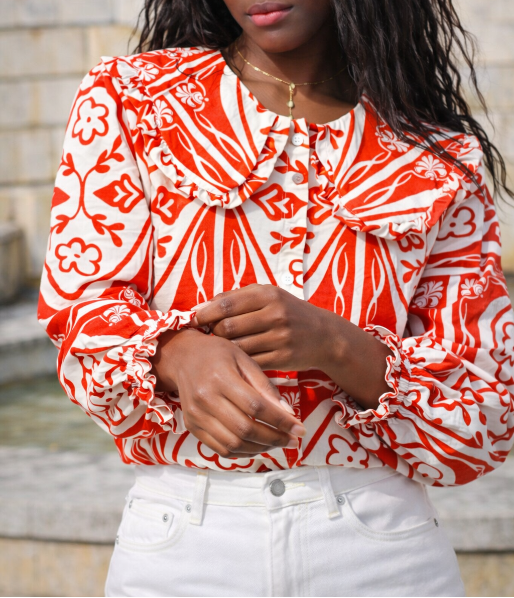 Chemise Anike : * Matière légère et agréable à porter * Imprimé graphique bicolore, fort et iconique * Coupe droite, facile au quotidien * Col claudine avec finitions volantées * Boutonnage sur le devant * Manches longues avec poignets boutonnés
