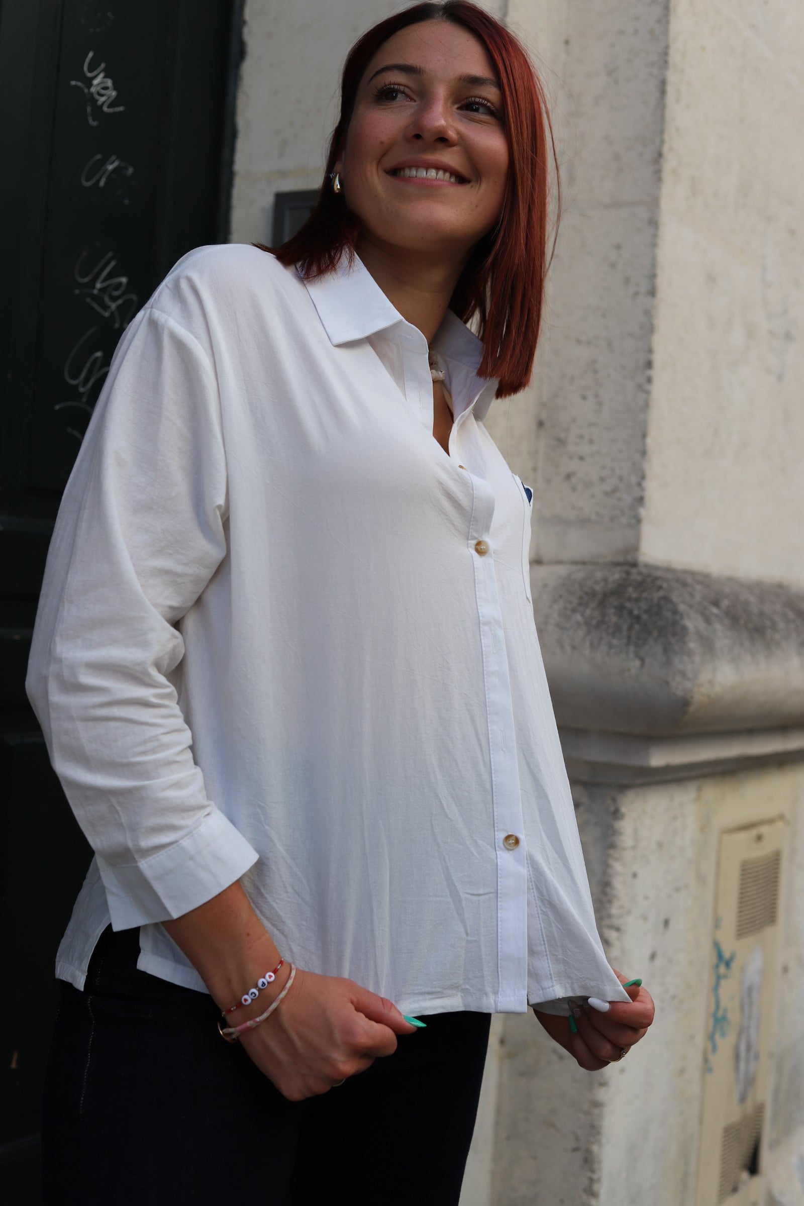 Redécouvrez le charme des basiques avec cette chemise blanche femme 100 % coton, douce, respirante et parfaite pour toutes les saisons. Son col classique, ses boutons dorés contrastés et la poche poitrine ornée d’un petit cœur brodé apportent une touche raffinée à ce classique intemporel.