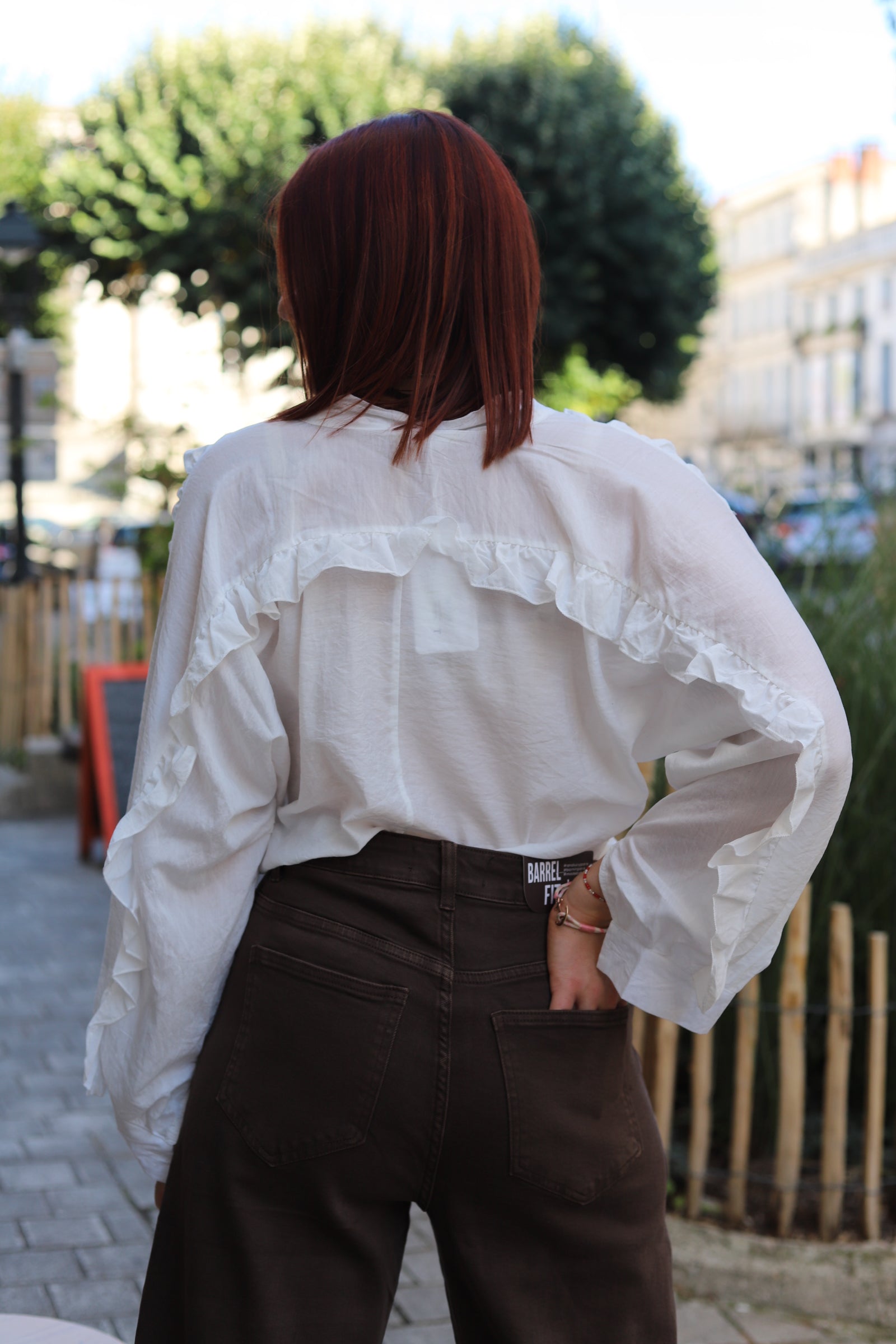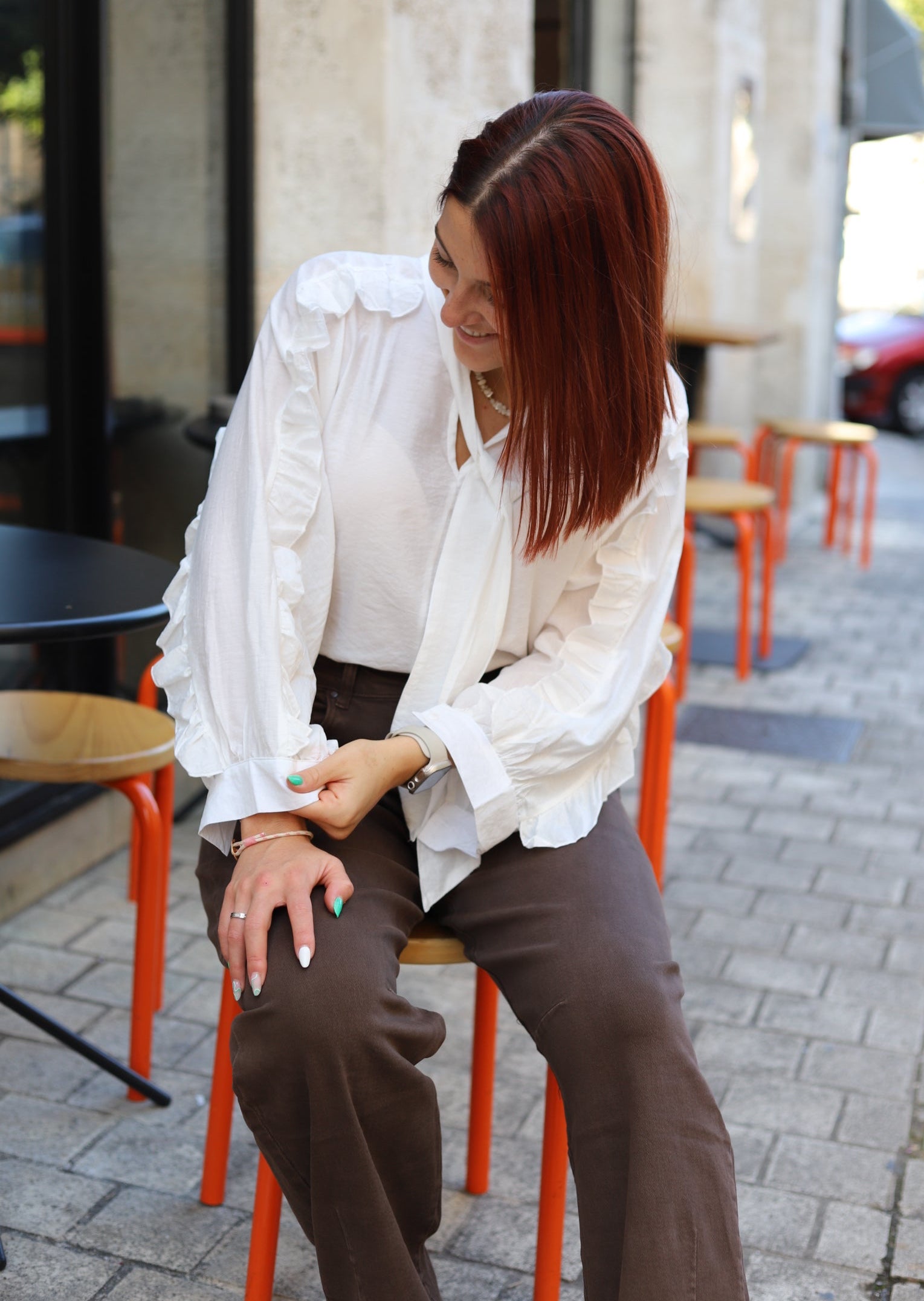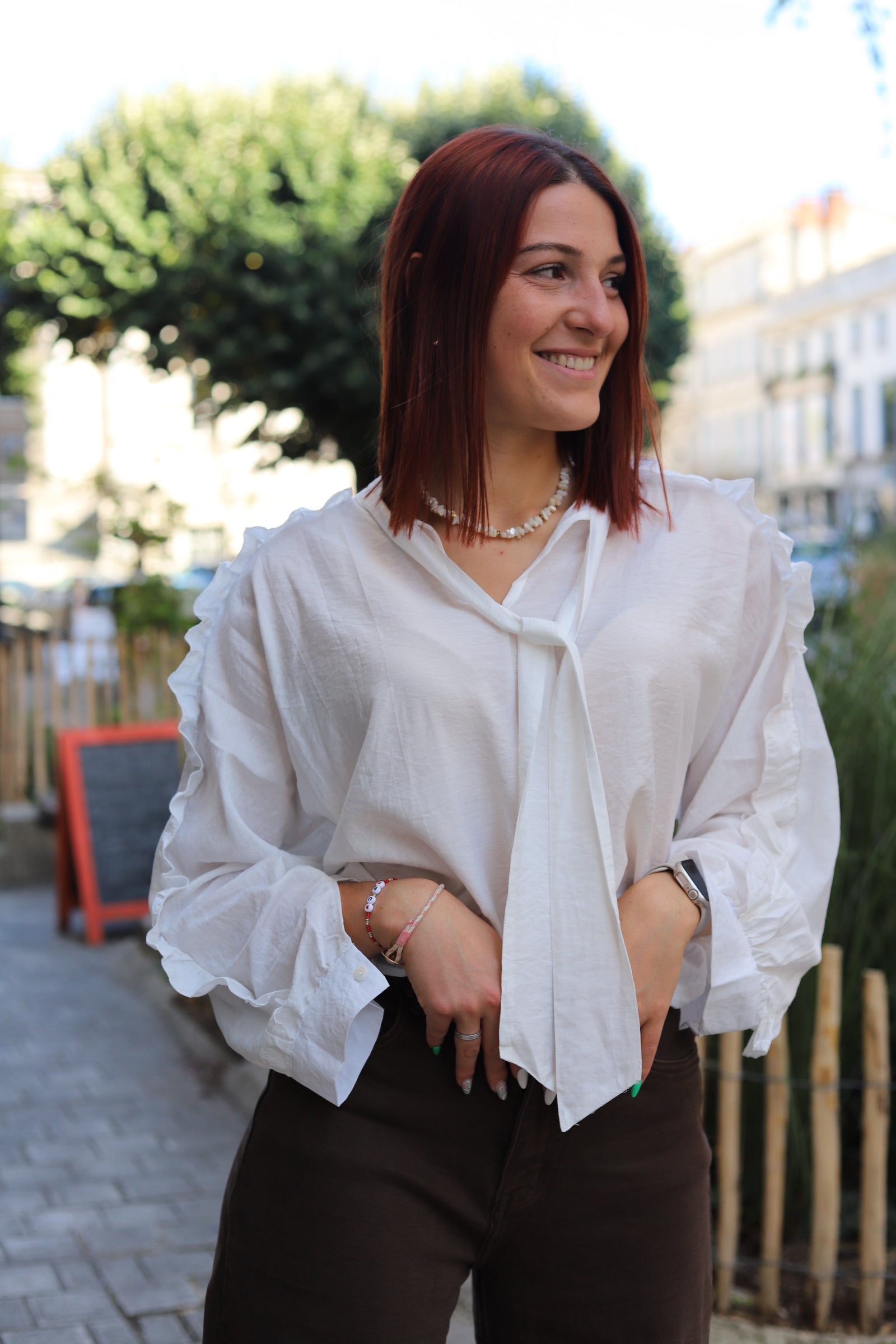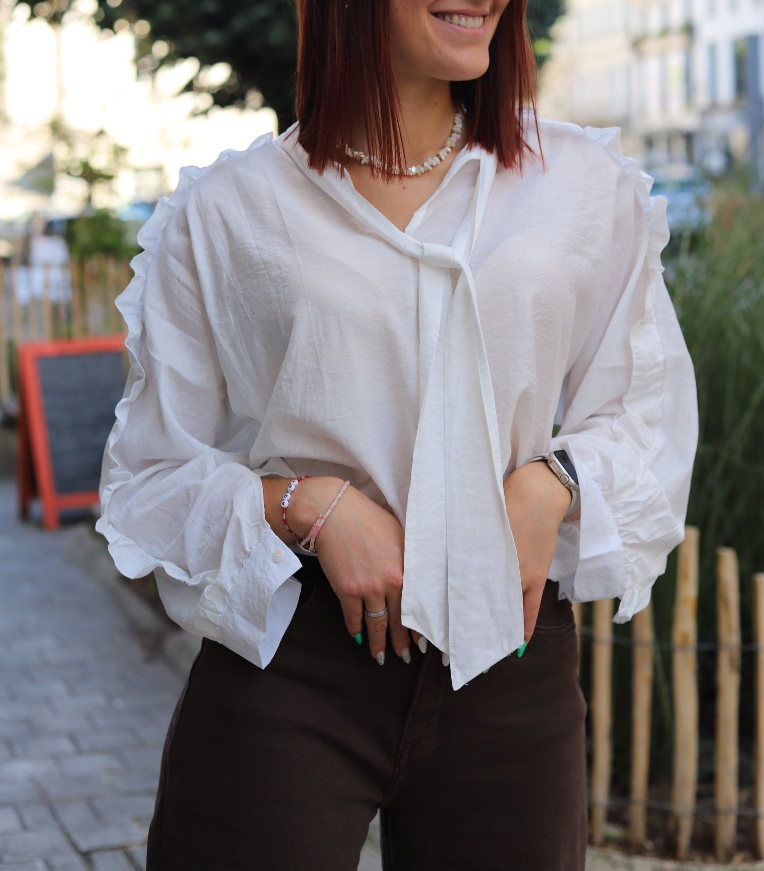Chemise blanche femme à volants & lavallière – look romantique chic.