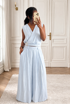 Cet ensemble bleu séduit par sa silhouette fluide et son élégance naturelle. Composé d’un top sans manches à coupe cache-cœur et d’un pantalon large fluide, il dessine une allure féminine, élancée et facile à porter, idéale pour les journées où l’on recherche à la fois confort et raffinement.