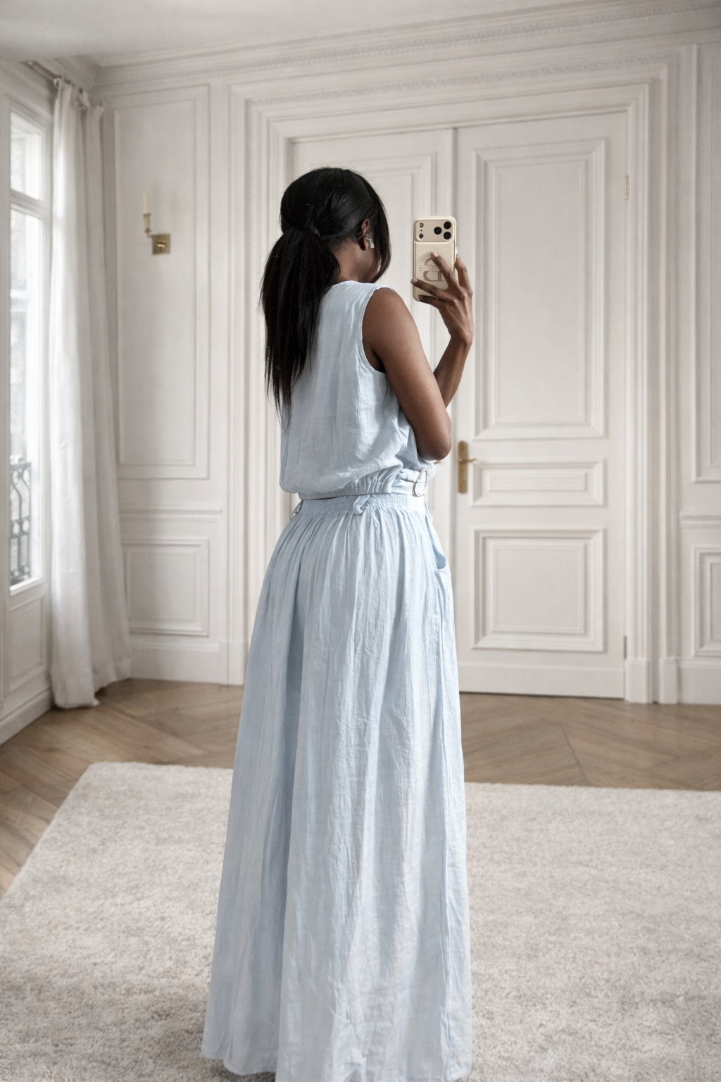 Un ensemble bleu fluide et féminin, pensé pour une élégance simple et naturelle.