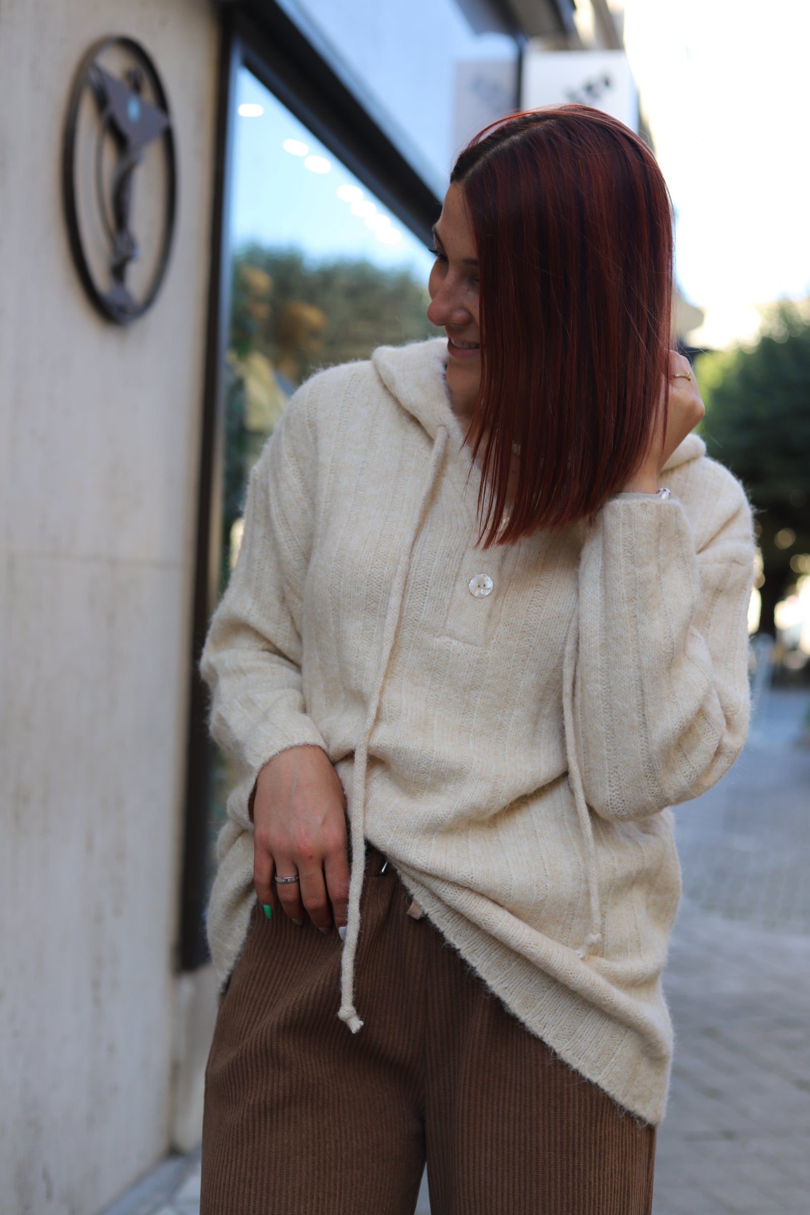 Pull à capuche femme en maille côtelée beige – Douceur & chaleur au quotidien