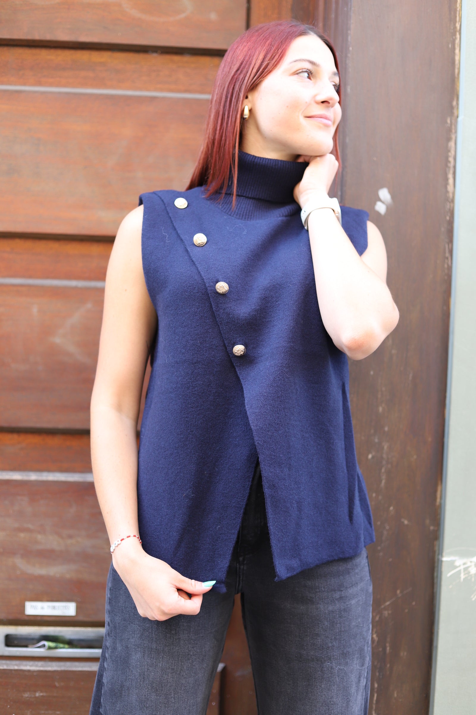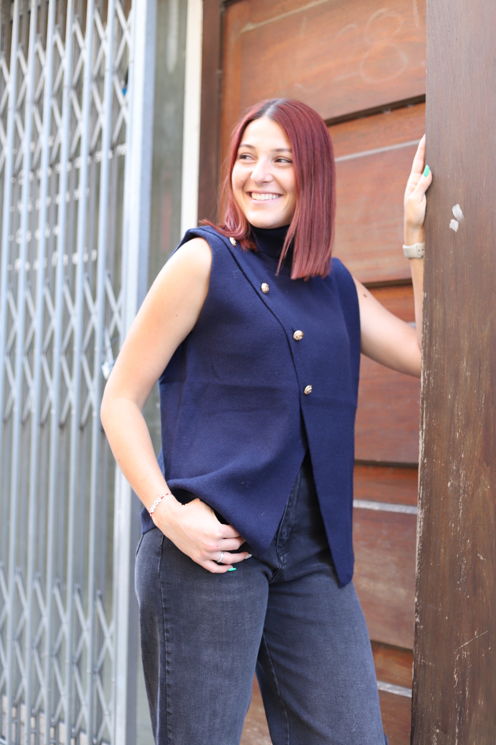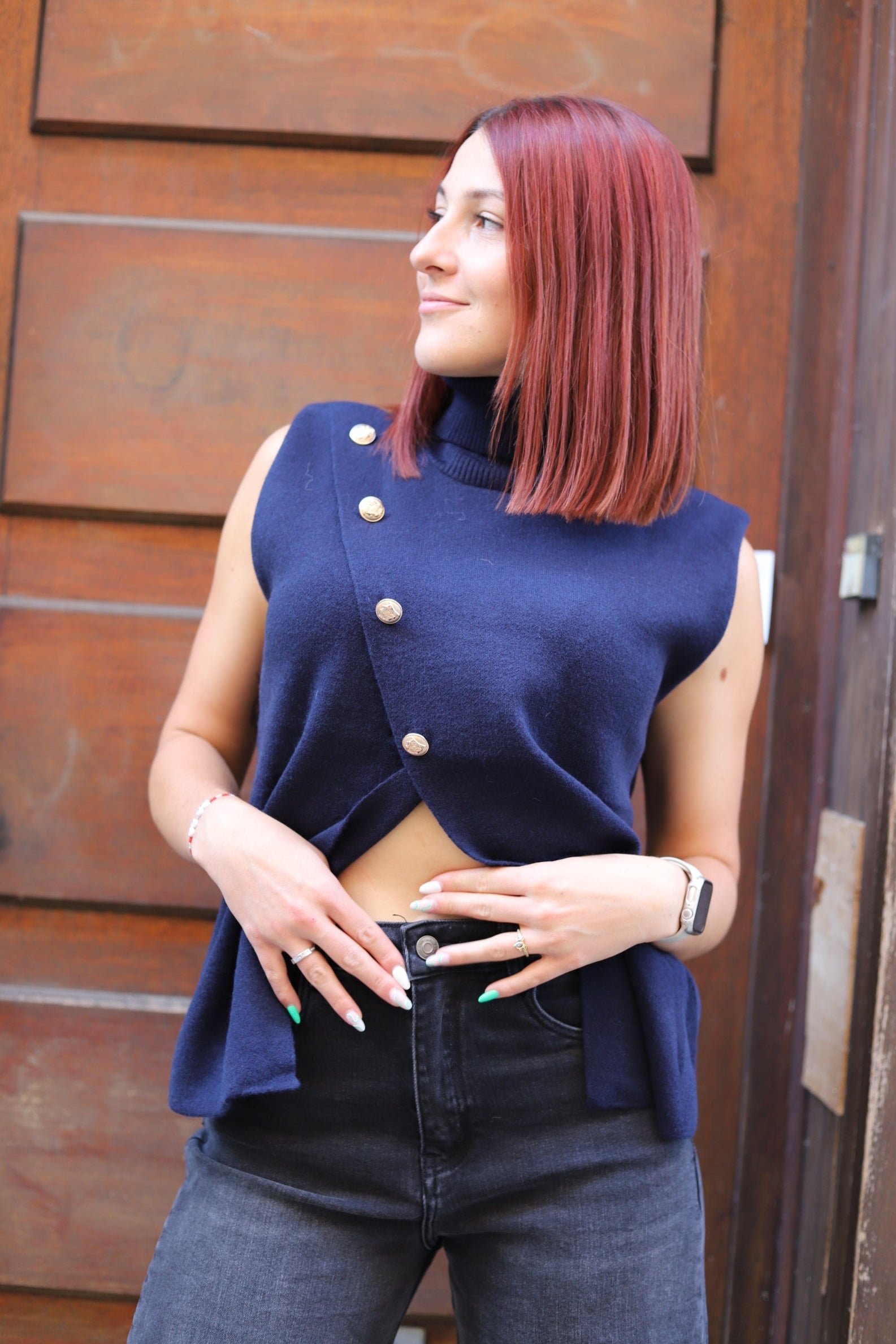 Sa coupe droite élégante est rehaussée par une patte croisée décorative avec boutons dorés, qui apporte personnalité et raffinement. Idéal pour la superposition : portez-le sur une chemise blanche pour un style bureau chic, ou sur un tee-shirt fin pour une allure plus casual.