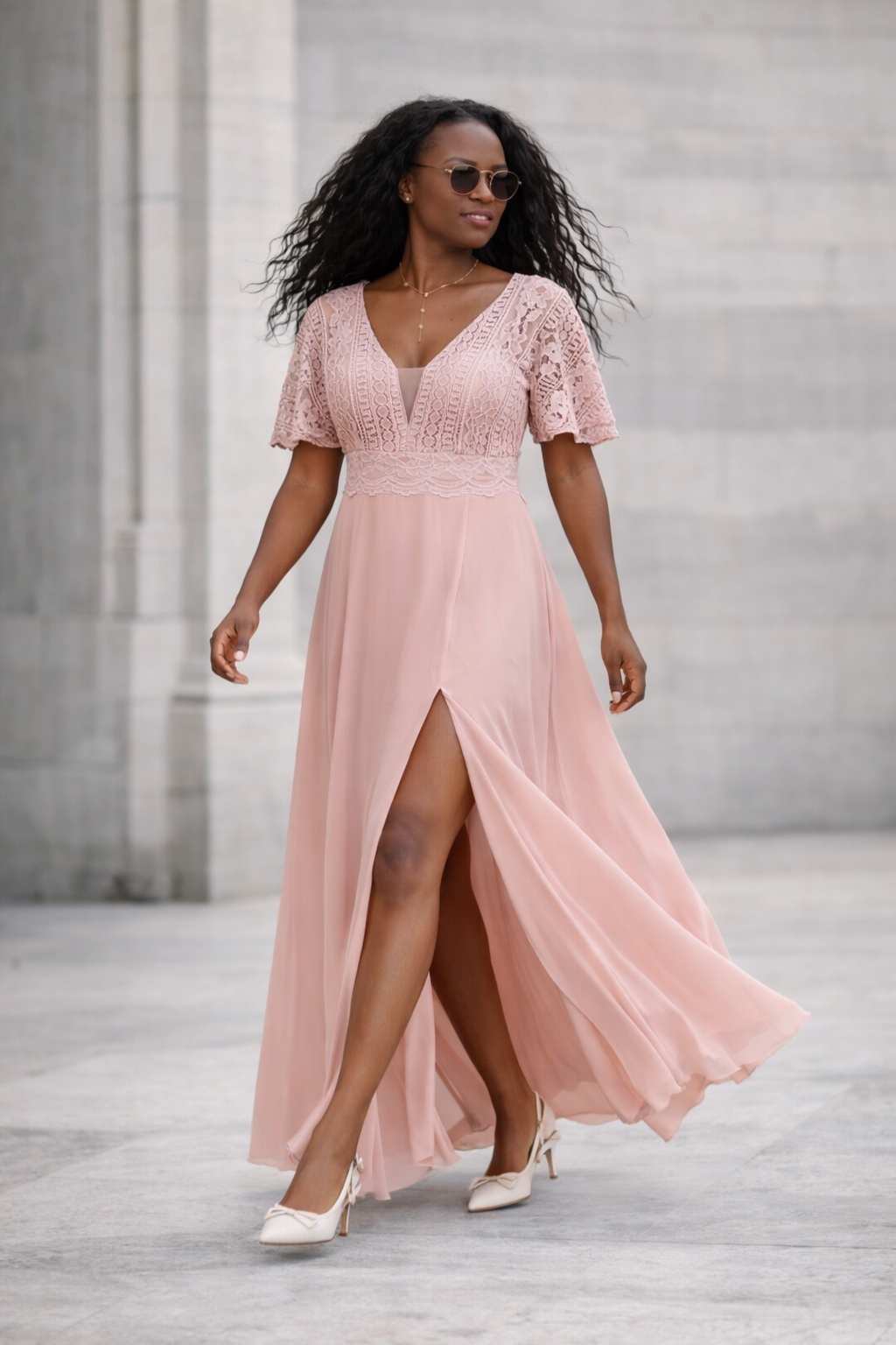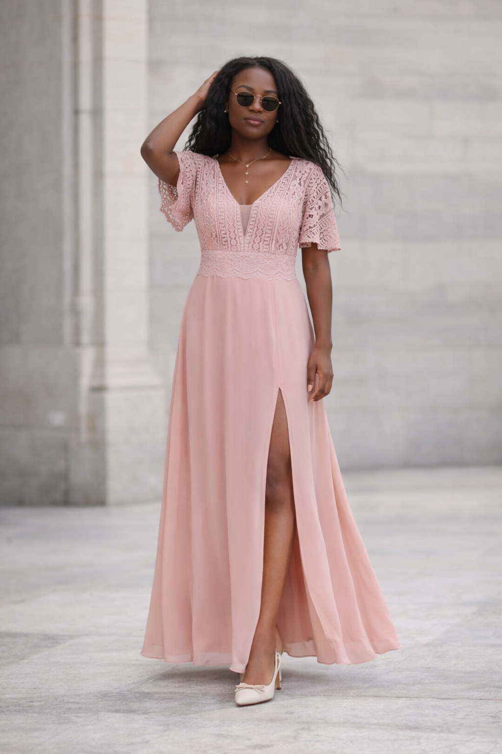 Élégante et féminine, cette robe de soirée longue rose poudré séduit par son bustier en dentelle, son encolure en V et sa jupe fluide fendue qui allonge la silhouette avec raffinement. Les manches courtes en dentelle apportent une touche romantique, tandis que la taille marquée structure l’ensemble avec délicatesse.