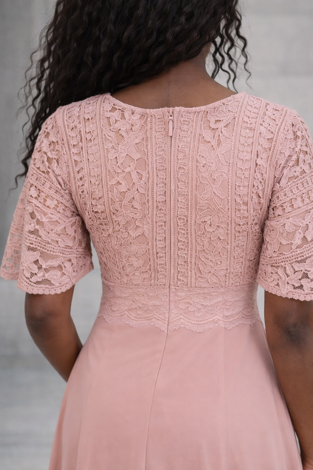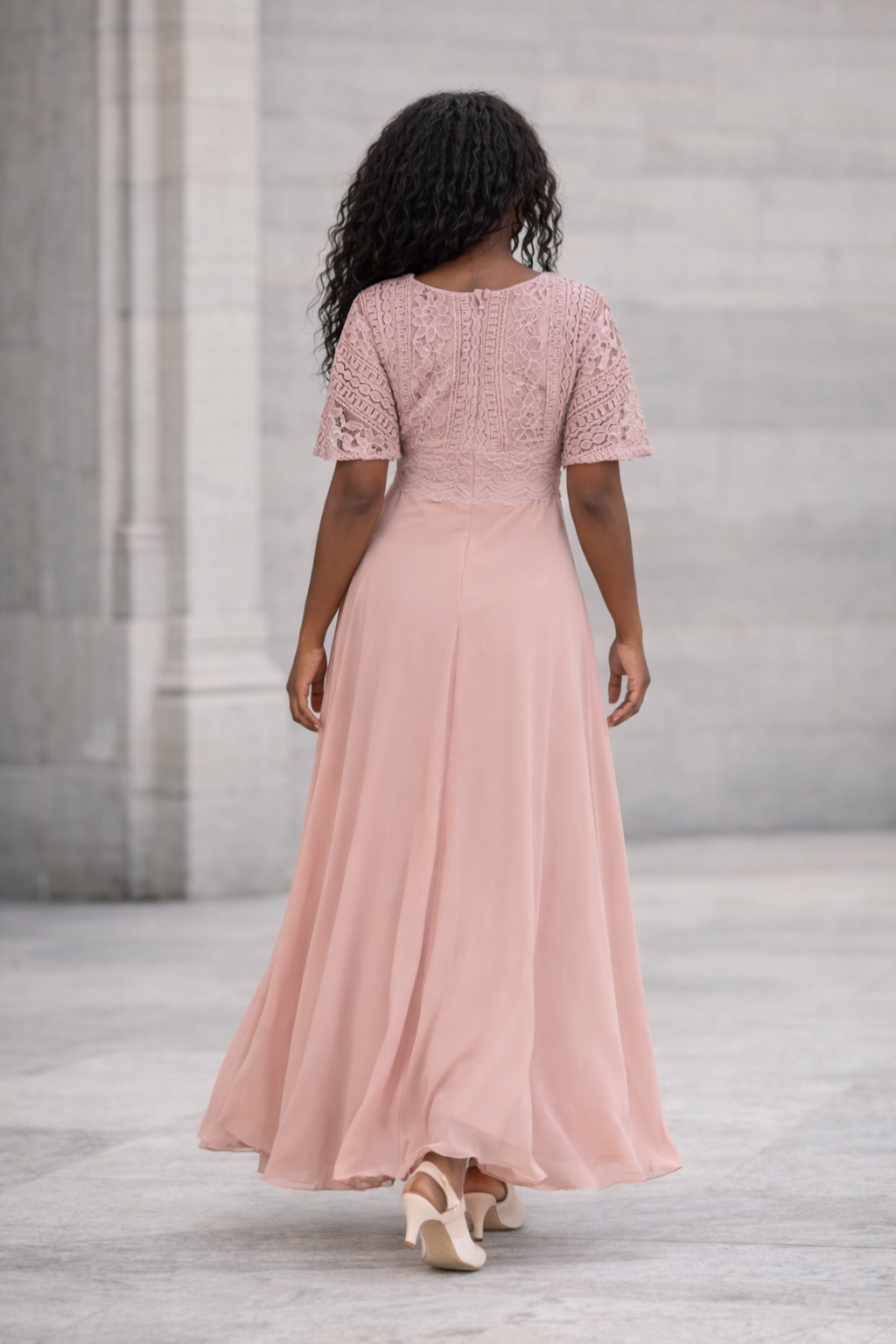 Robe de soirée longue rose poudré en dentelle