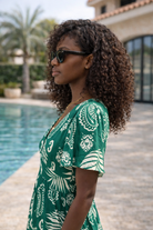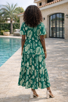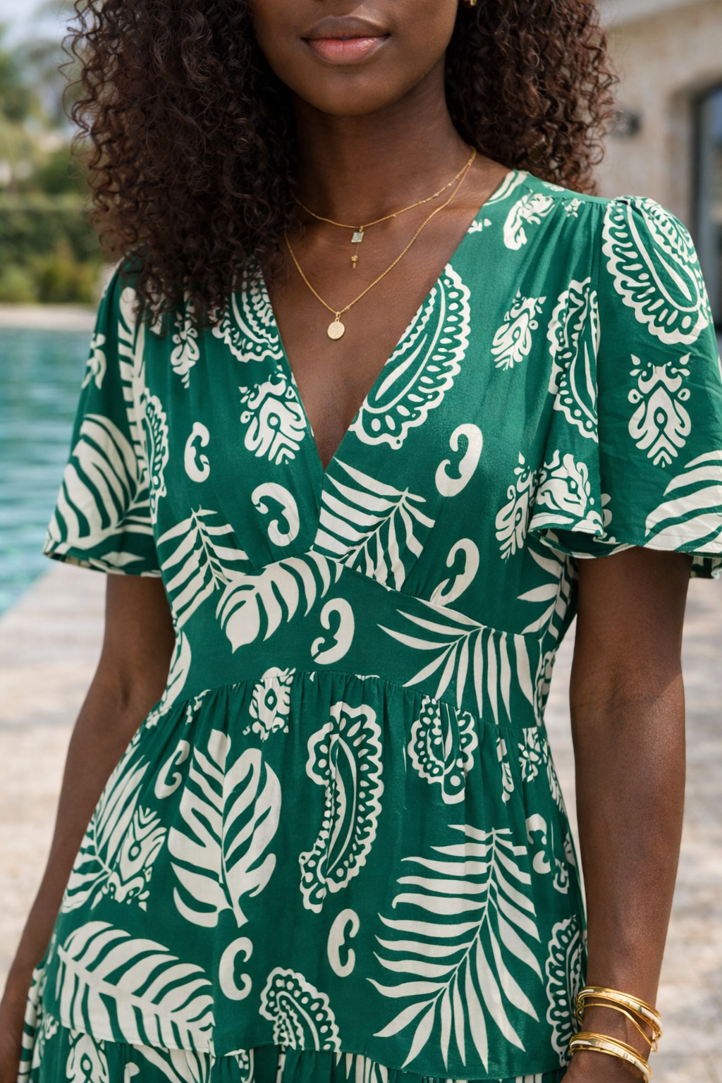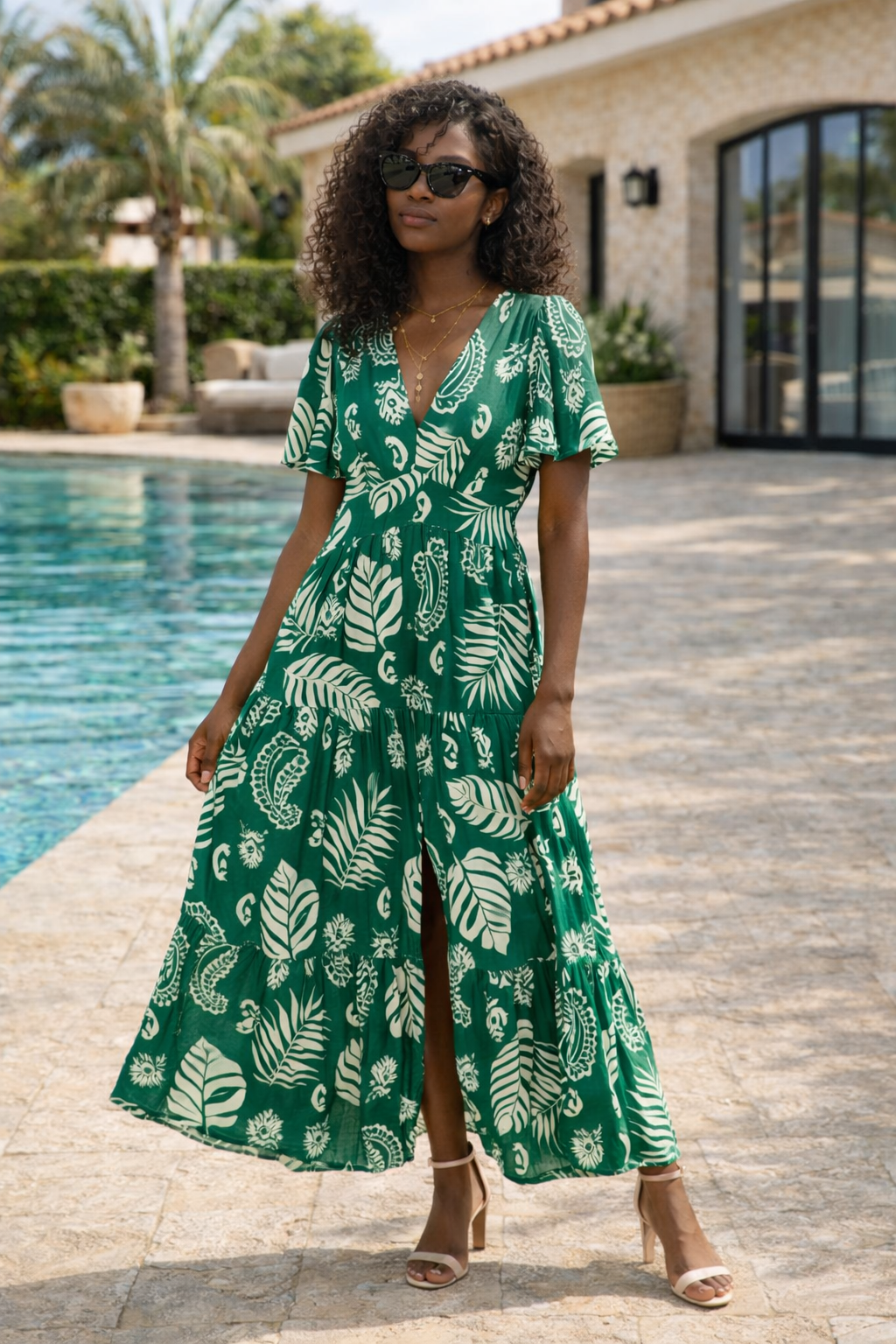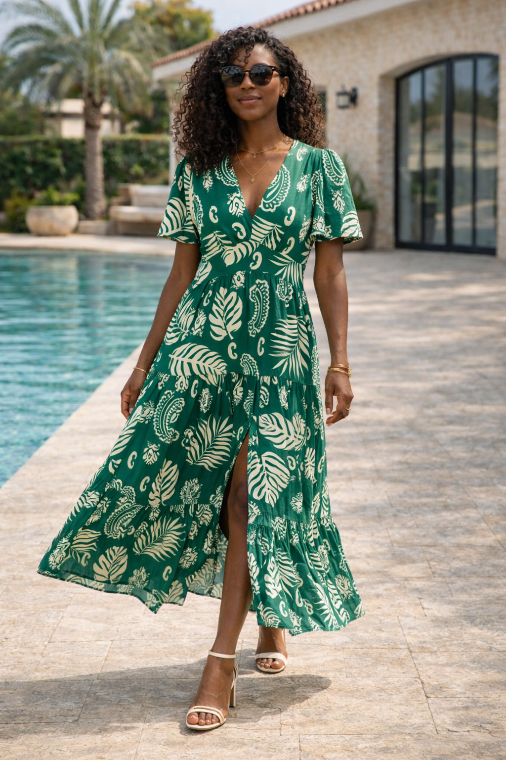 Avec son imprimé végétal contrasté et sa ligne fluide, cette robe longue verte apporte une allure bohème chic très actuelle. Son décolleté en V croisé met délicatement le buste en valeur, tandis que ses manches courtes volantées donnent du mouvement et une touche féminine légère, parfaite pour la saison.