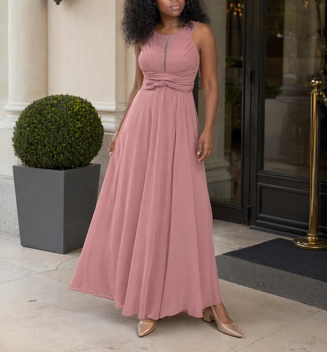 Cette robe longue de soirée est idéale pour un mariage, une cérémonie, une réception, un gala ou une soirée élégante. Elle se porte avec des sandales à talons ou des escarpins, une pochette raffinée et quelques bijoux dorés pour souligner son allure féminine. Son tombé fluide et son travail de plissé en font une pièce parfaite pour une silhouette sophistiquée sans rigidité.