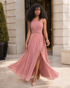 Pensée pour les cérémonies, soirées et grandes occasions, cette robe habillée conjugue sophistication et fluidité. La fente discrète allonge visuellement la silhouette, tandis que le dos travaillé avec ouverture apporte une note couture subtile. Une pièce idéale pour celles qui recherchent une robe longue élégante, aérienne et résolument chic.