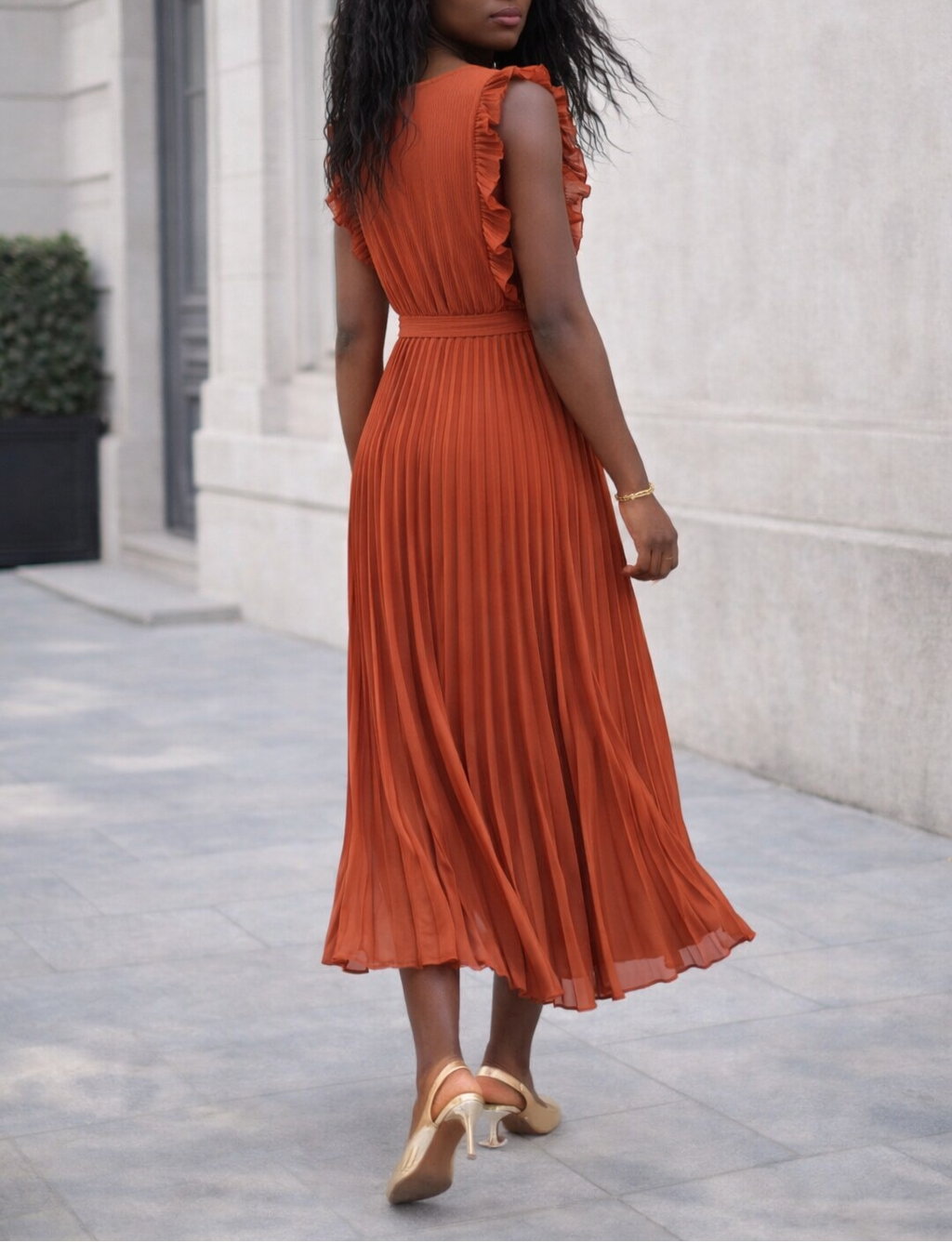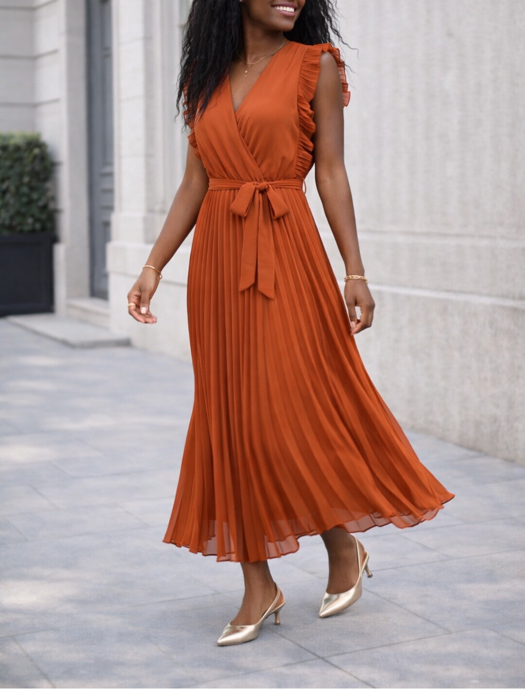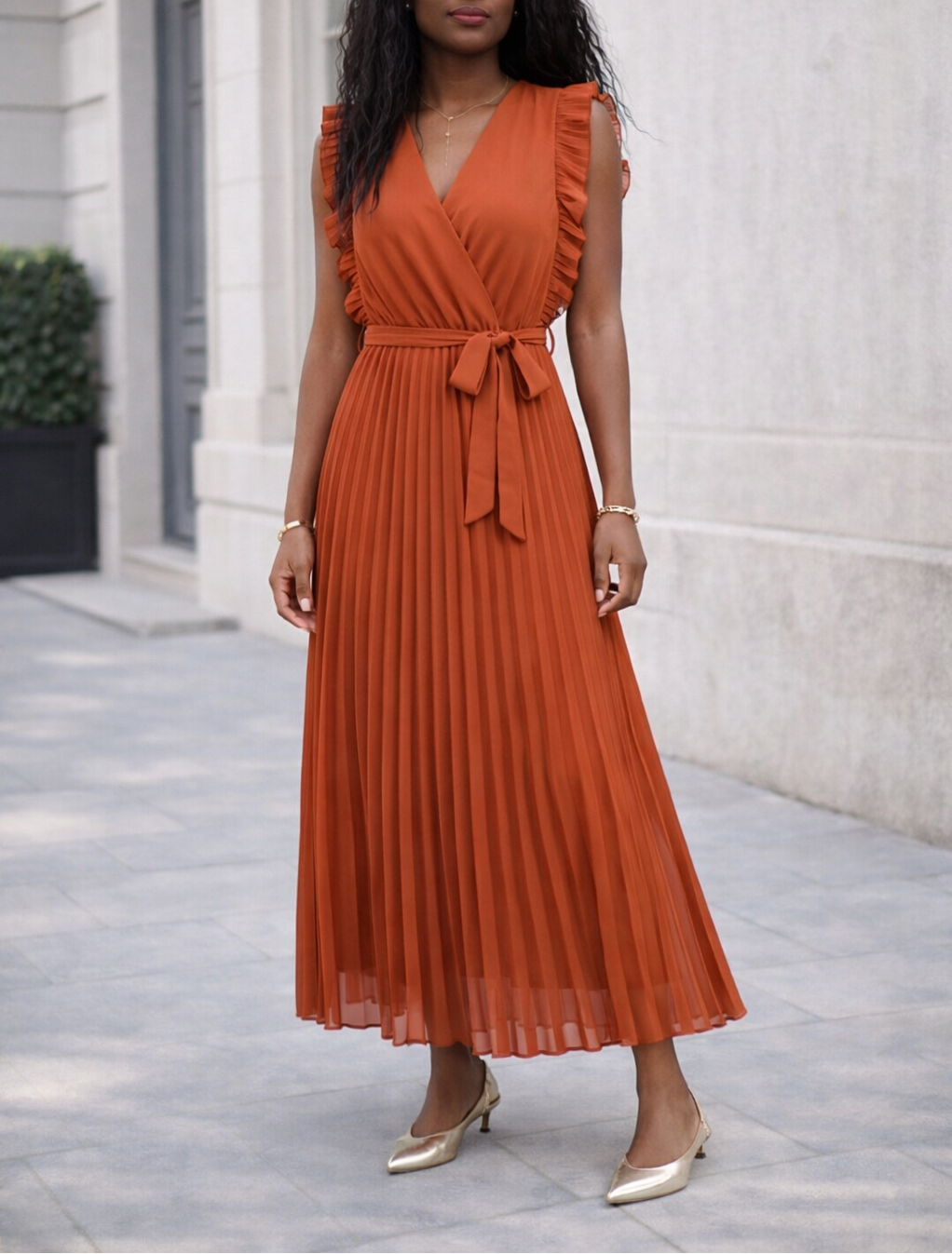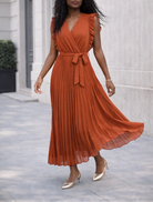 Robe longue plissée terracotta ceinturée