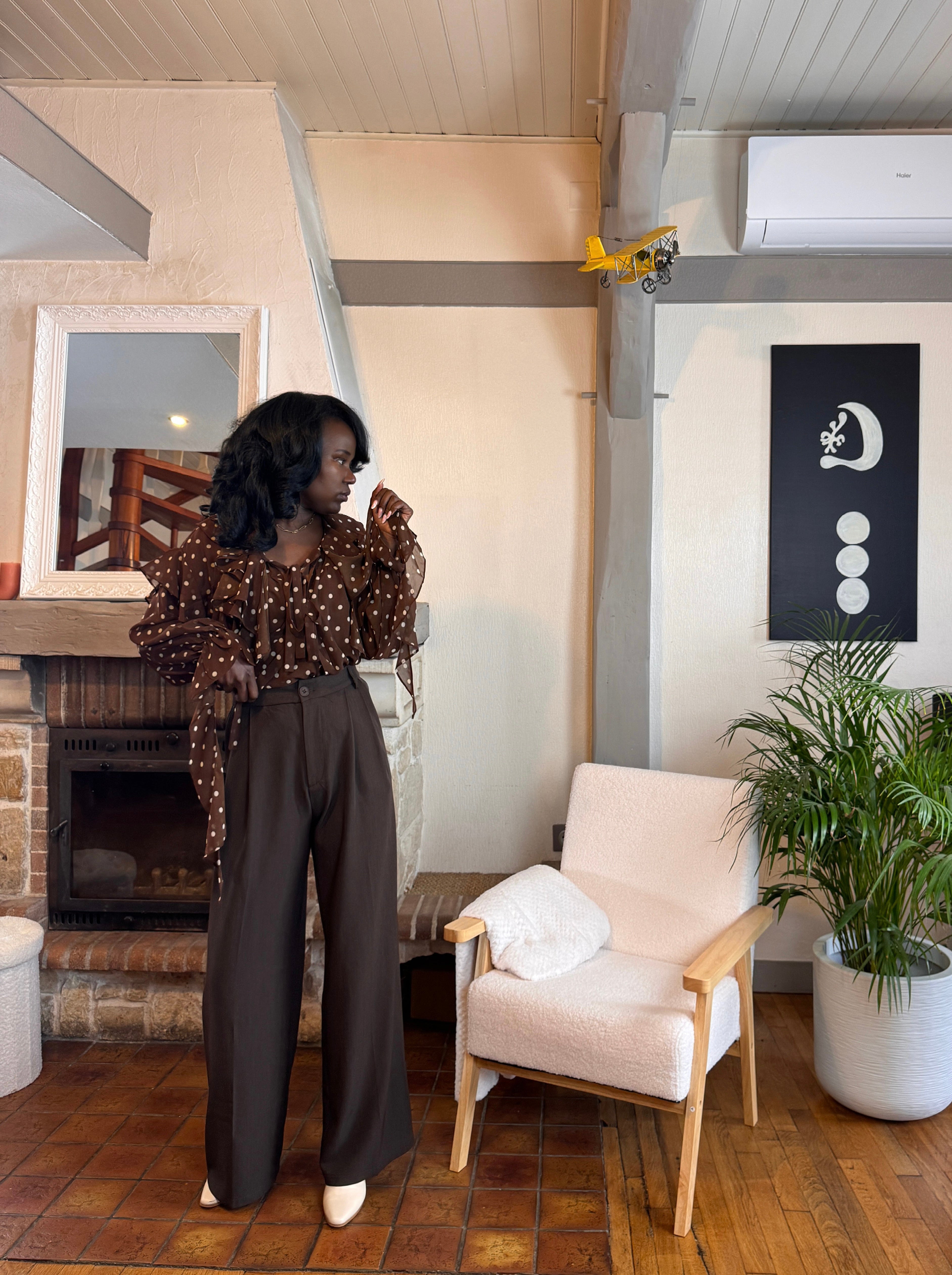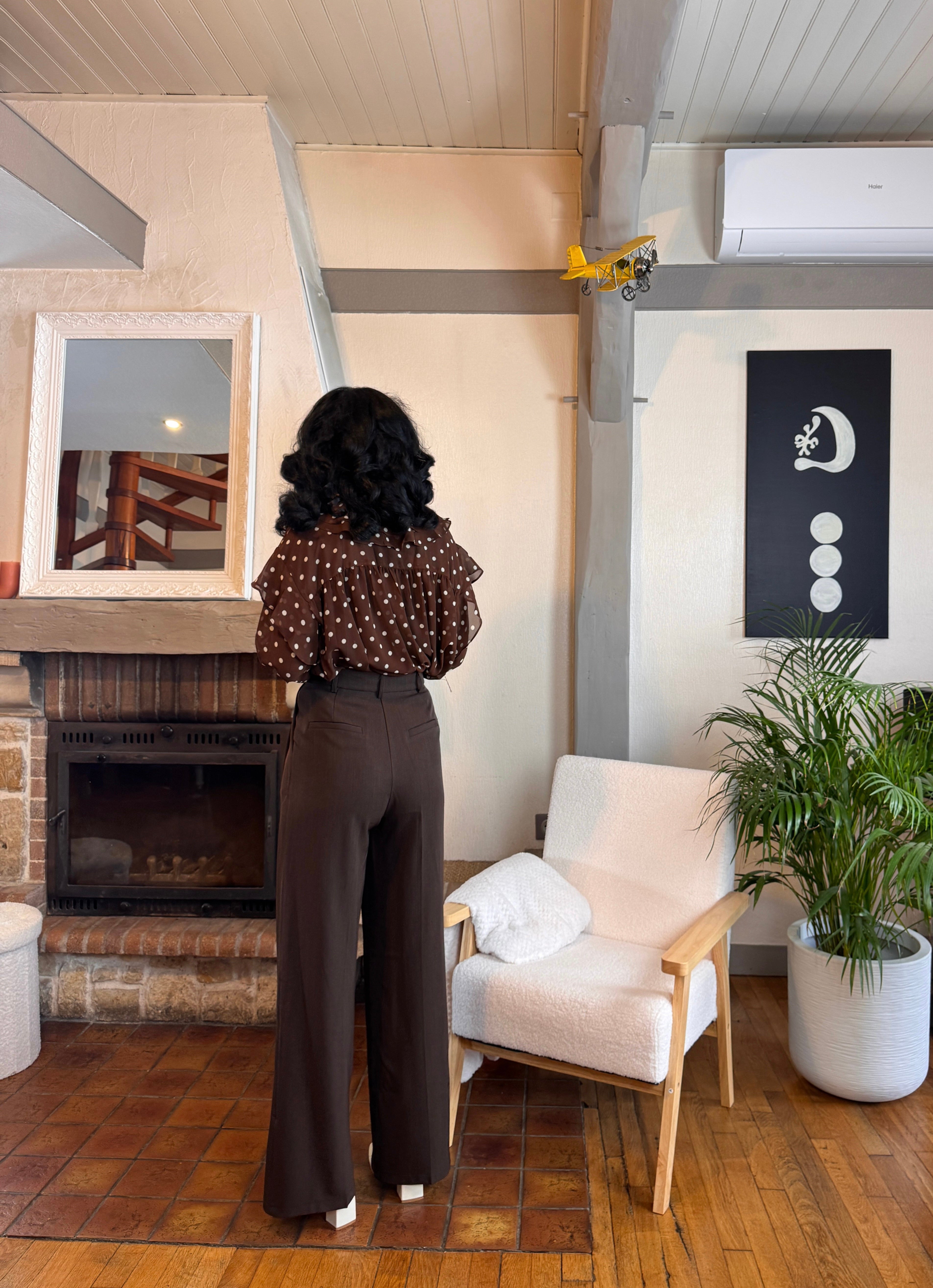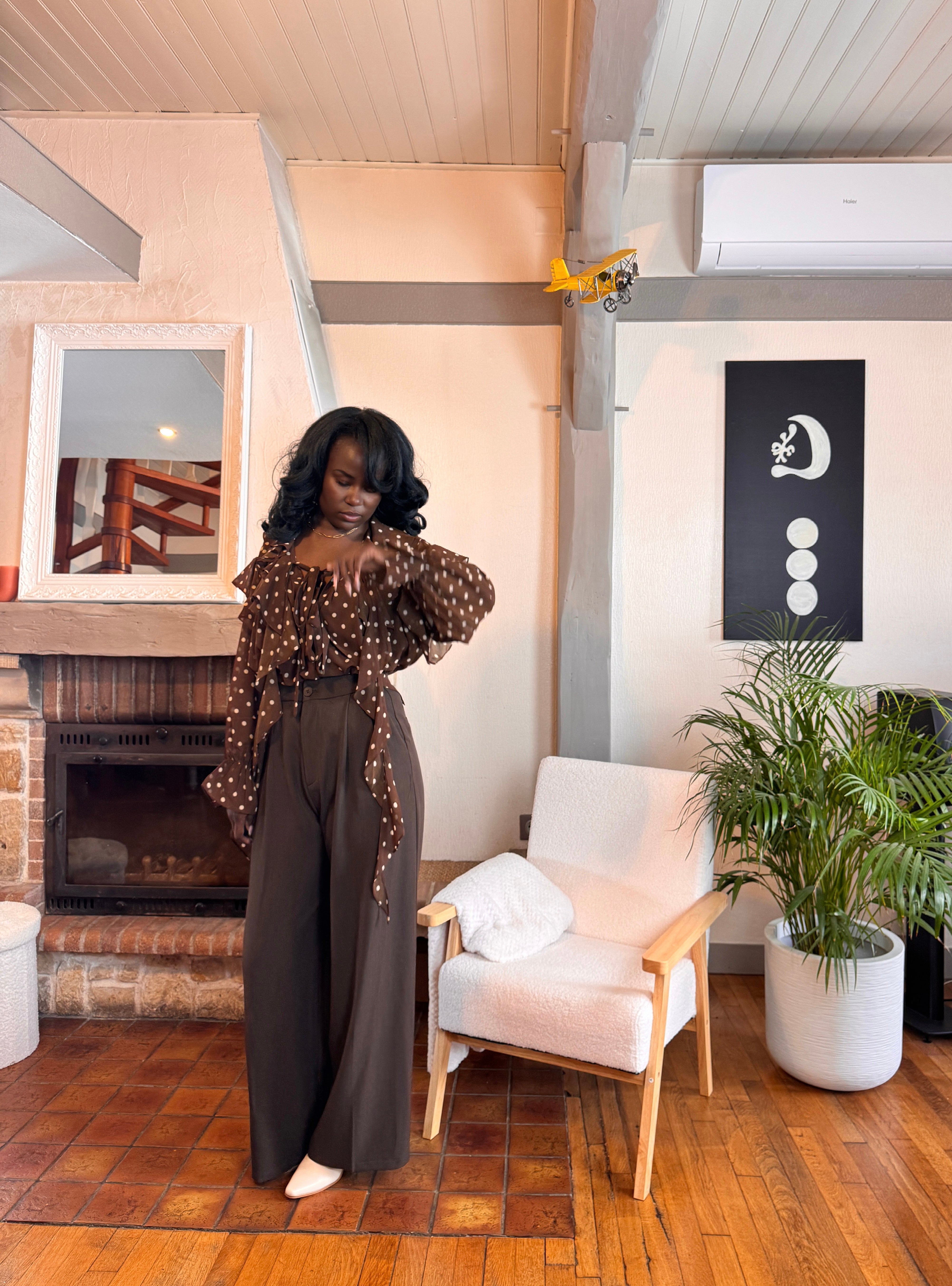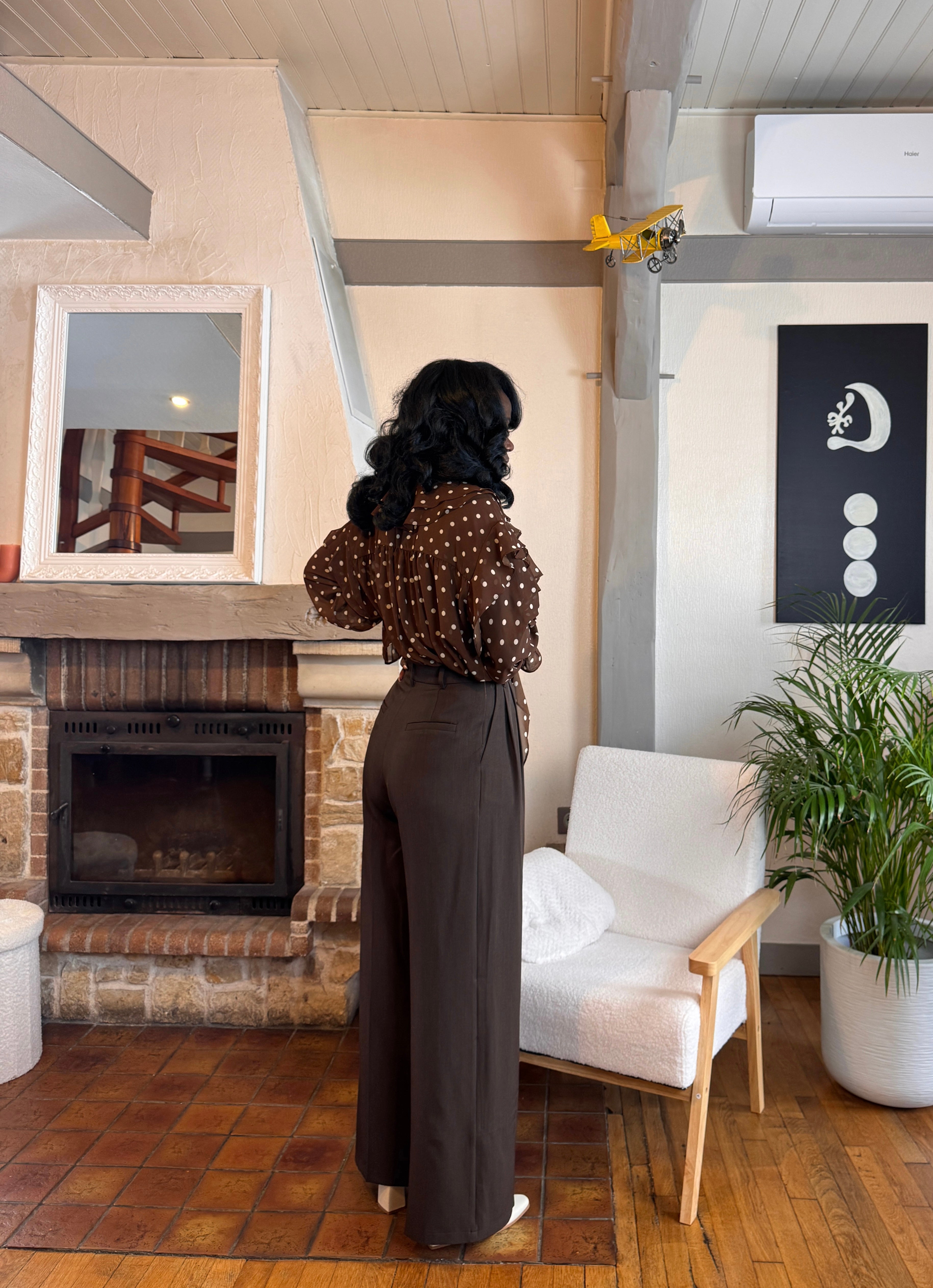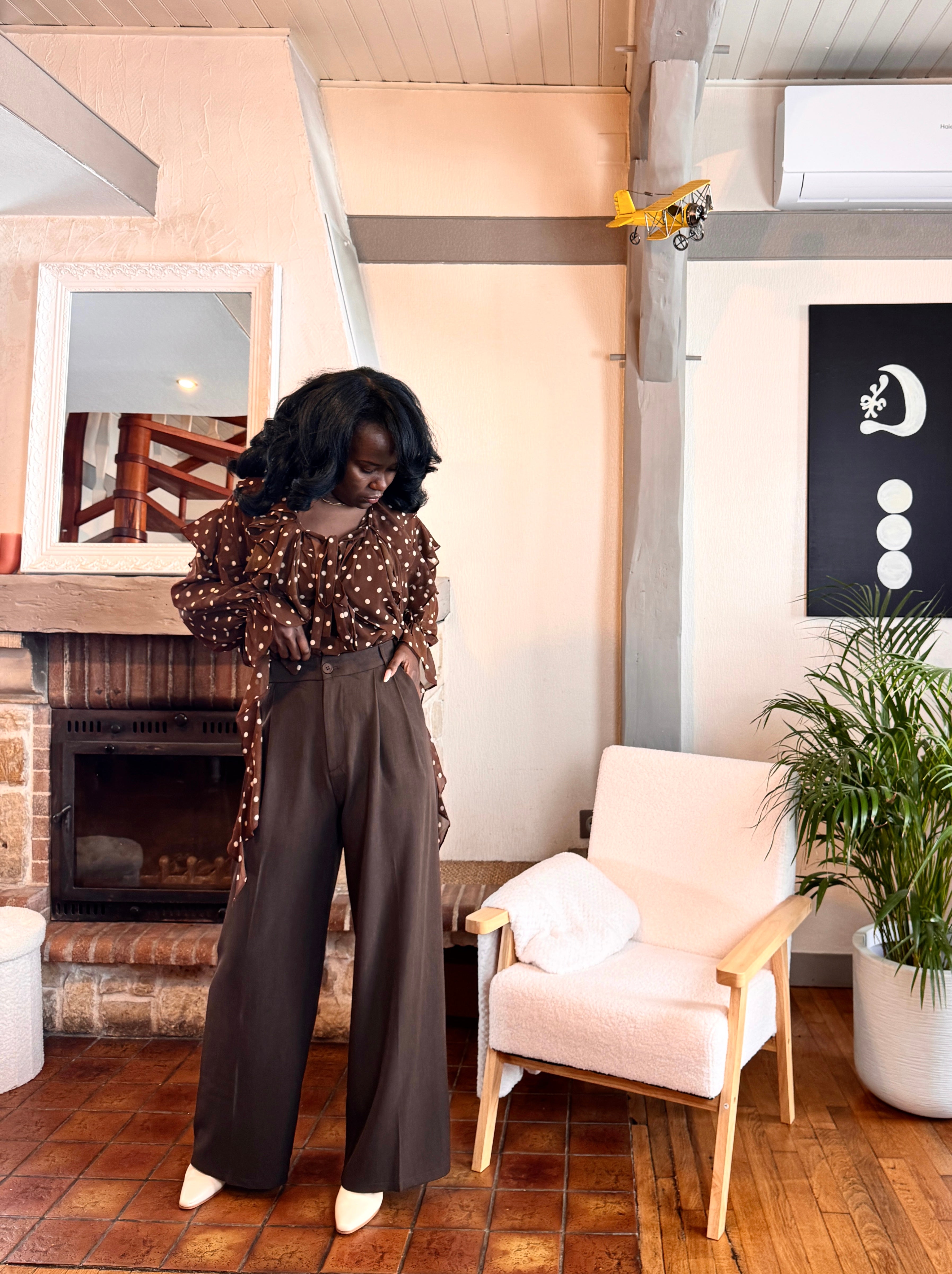 Ce pantalon fluide chocolat est la pièce parfaite pour un look chic sans effort. Avec sa taille haute flatteuse et sa coupe palazzo, il allonge la silhouette tout en offrant un confort absolu. Que ce soit pour le bureau, un rendez-vous ou une sortie, il s’adapte à toutes les occasions.