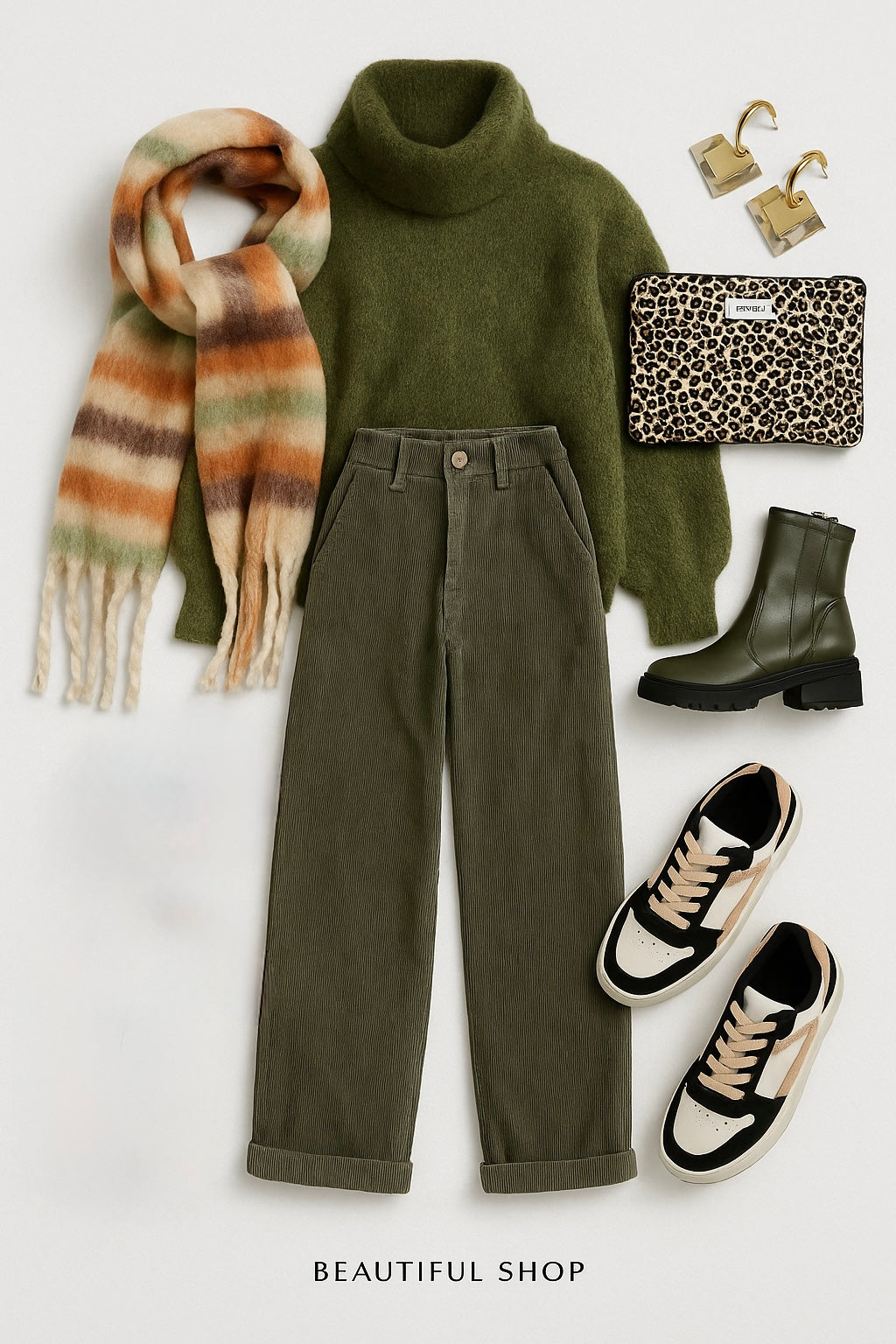 Ajoute un manteau camel ou une veste en fausse fourrure pour une tenue de saison stylée et chaleureuse.