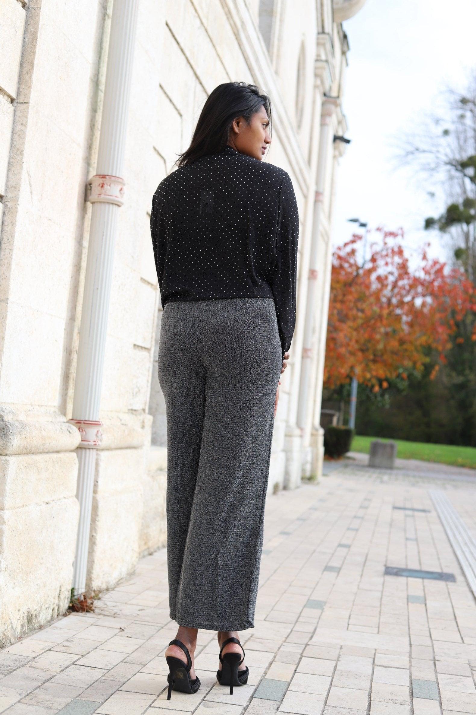 Ajoutez une touche de glamour à votre dressing avec ce pantalon fluide argent pailleté. Idéal pour une tenue chic et décontractée, il convient aux tailles 36 à 42 grâce à sa taille élastique.
