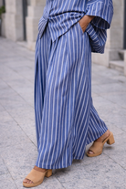 Ce pantalon large rayé bleu se porte aussi bien en journée qu’en week-end, avec un t-shirt ajusté, une blouse légère, une maille fine ou la chemise assortie pour un ensemble parfaitement équilibré. Il convient à une silhouette casual chic, une tenue de bureau décontractée ou un look de vacances élégant.