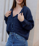 Coupe légèrement ample et sa patte croisée ornée de boutons dorés qui lui donnent une touche sophistiquée. Bleu marine profond, ce cardigan s’accorde aussi bien à un jean pour un style casual qu’à une jupe ou un pantalon tailleur pour une tenue plus habillée.