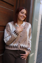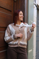 Son motif à losanges beige et marron revisite le style rétro avec élégance, tandis que sa patte boutonnée dorée lui donne un charme sophistiqué. Sa coupe légèrement loose le rend facile à superposer sur une chemise, un top ou une robe, pour un look casual chic en toutes occasions.