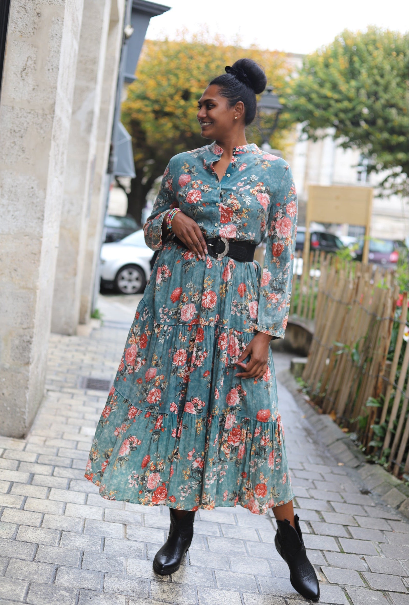 La robe qu’on enfile pour être élégante sans réfléchir, c’est elle ! Avec ses jolies fleurs sur fond vert délavé, cette robe longue à la coupe bohème te suit partout : au bureau, en week-end ou en soirée cosy avec des bottines.