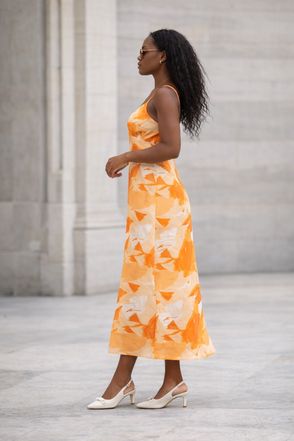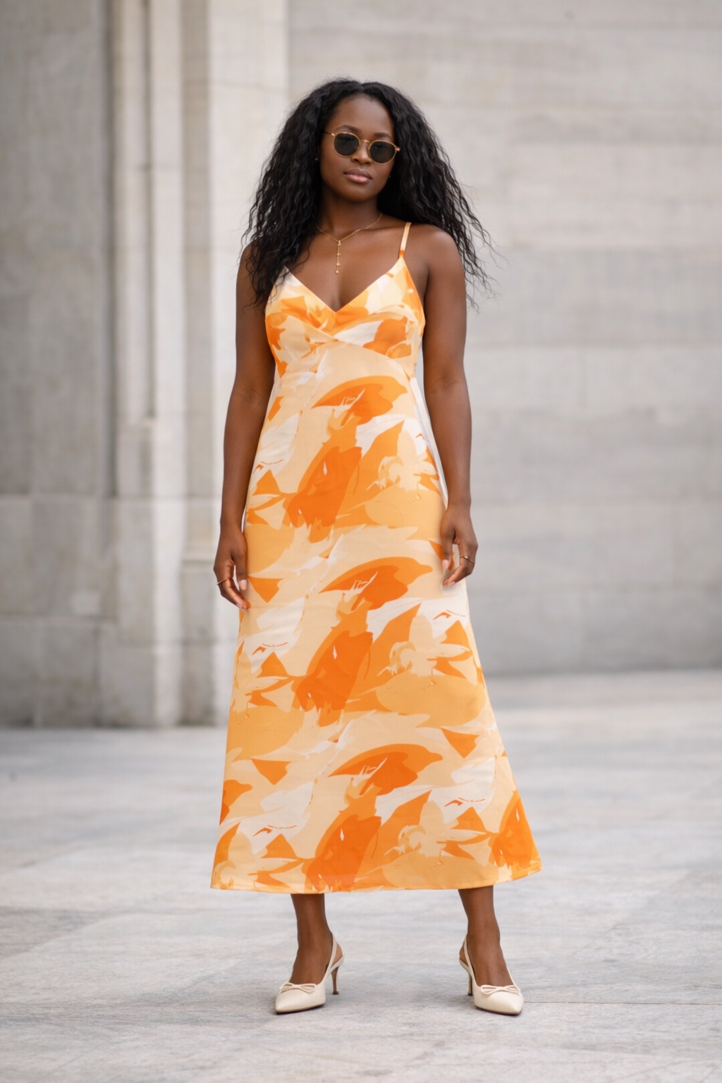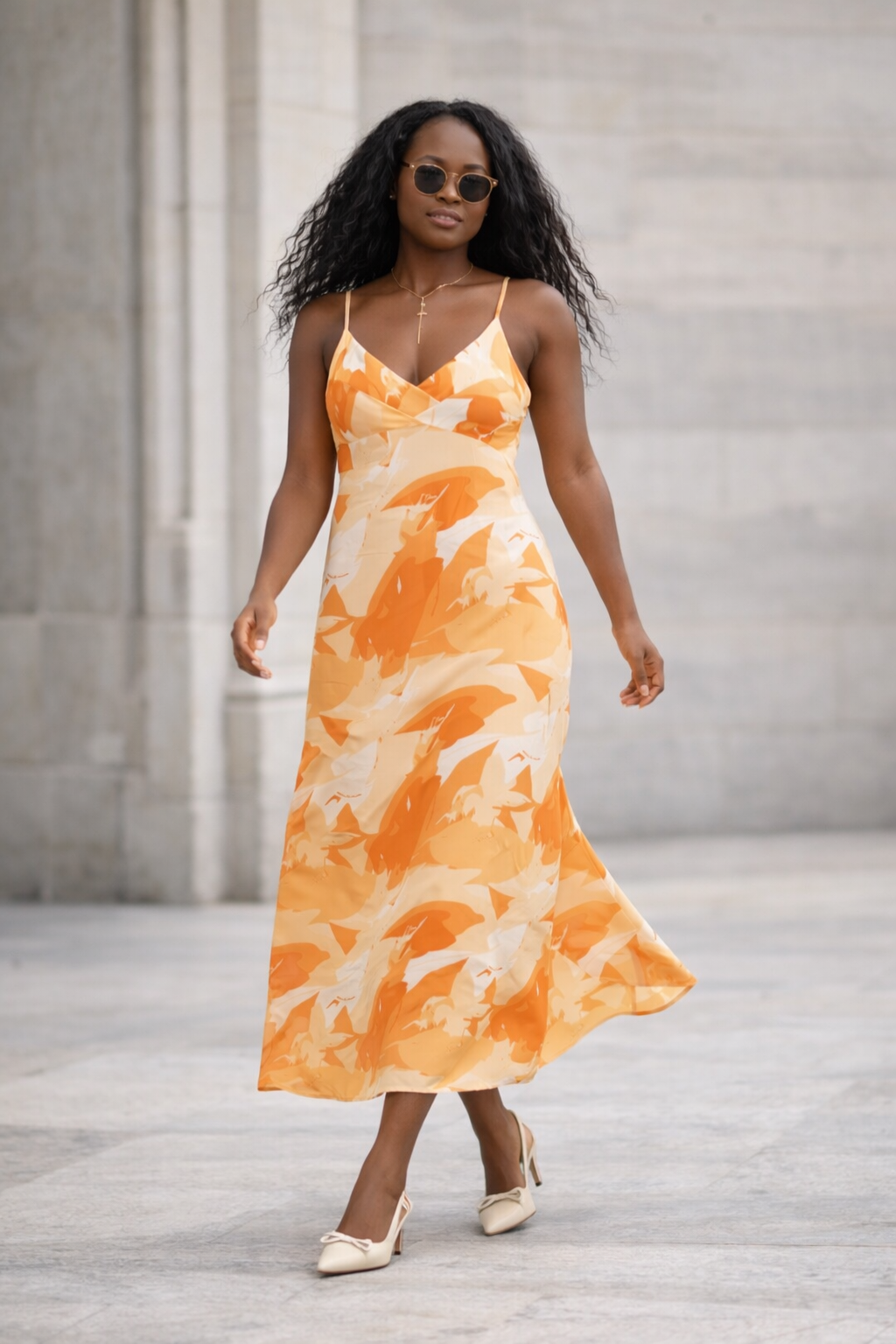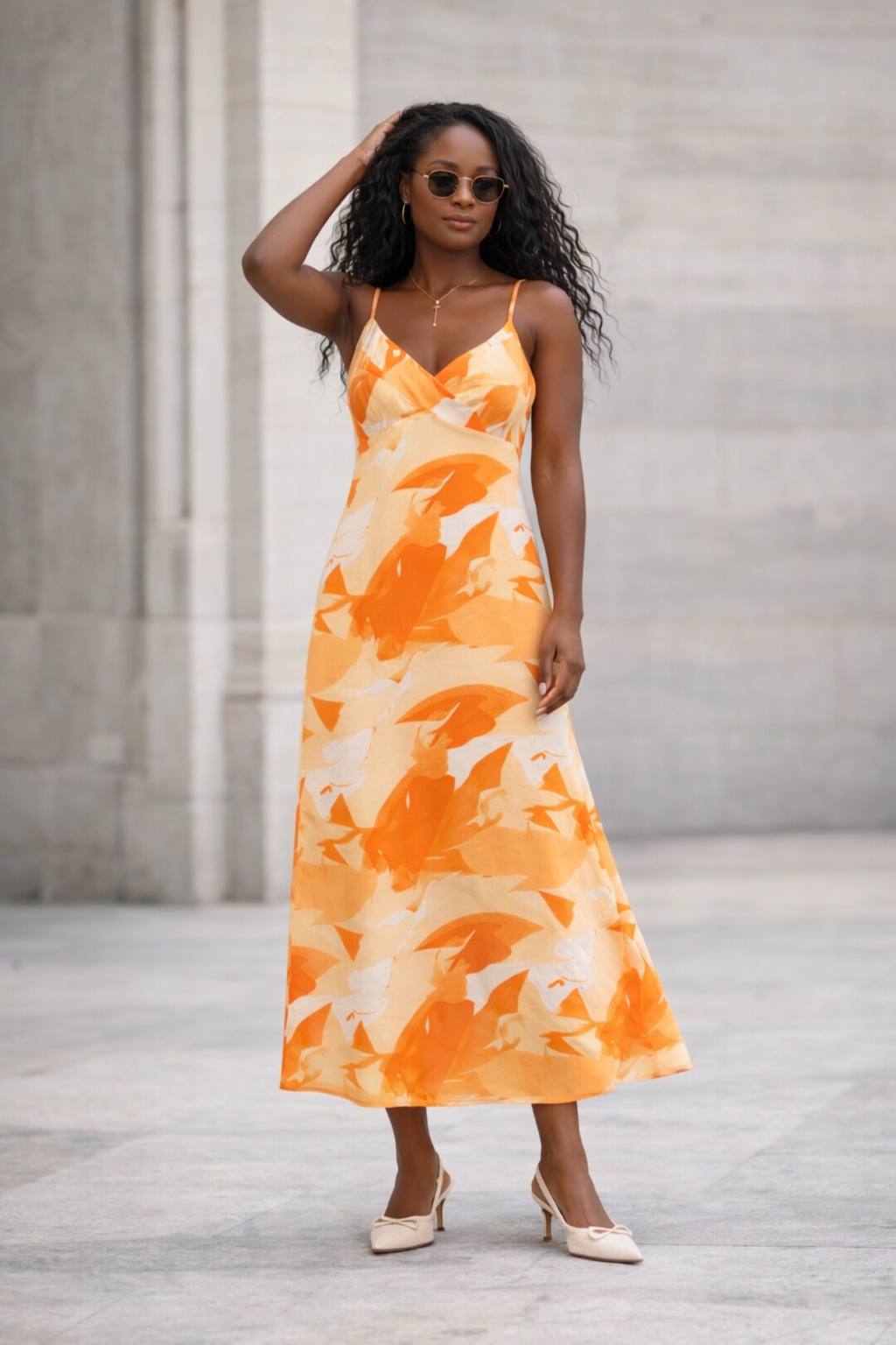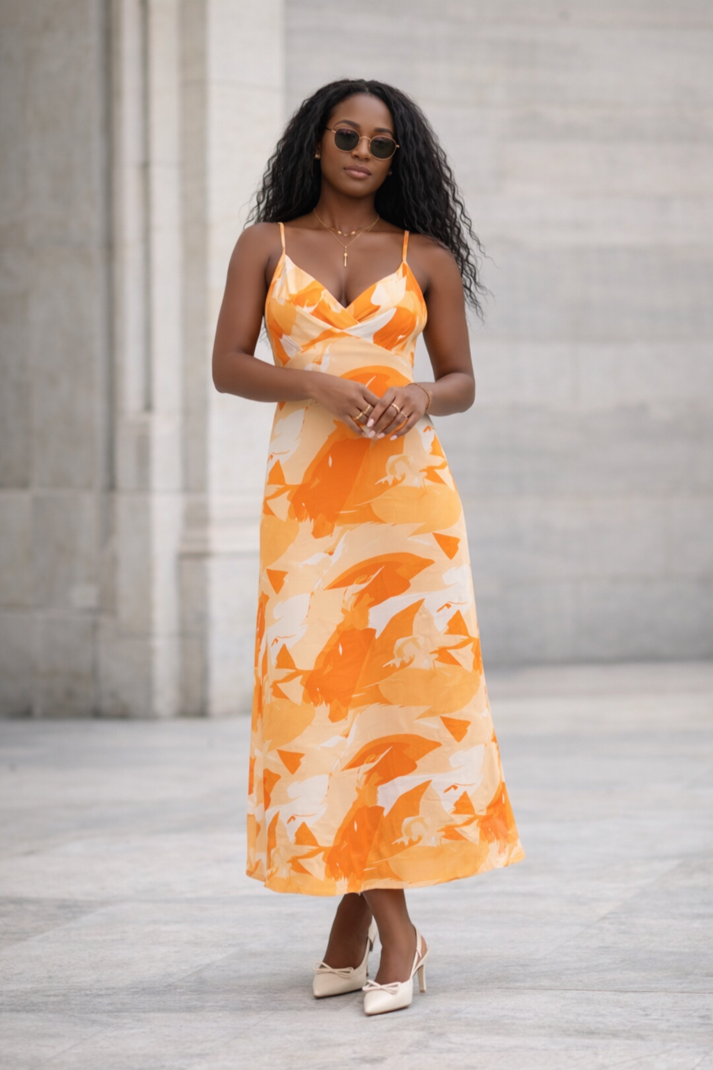 Avec sa coupe légèrement évasée et son imprimé aux tonalités orangées, cette robe longue accompagne le mouvement avec naturel et crée une allure raffinée sans effort. Parfaite pour une soirée d’été, un dîner en terrasse, des vacances ou une occasion habillée, elle allie confort visuel, fraîcheur et style.