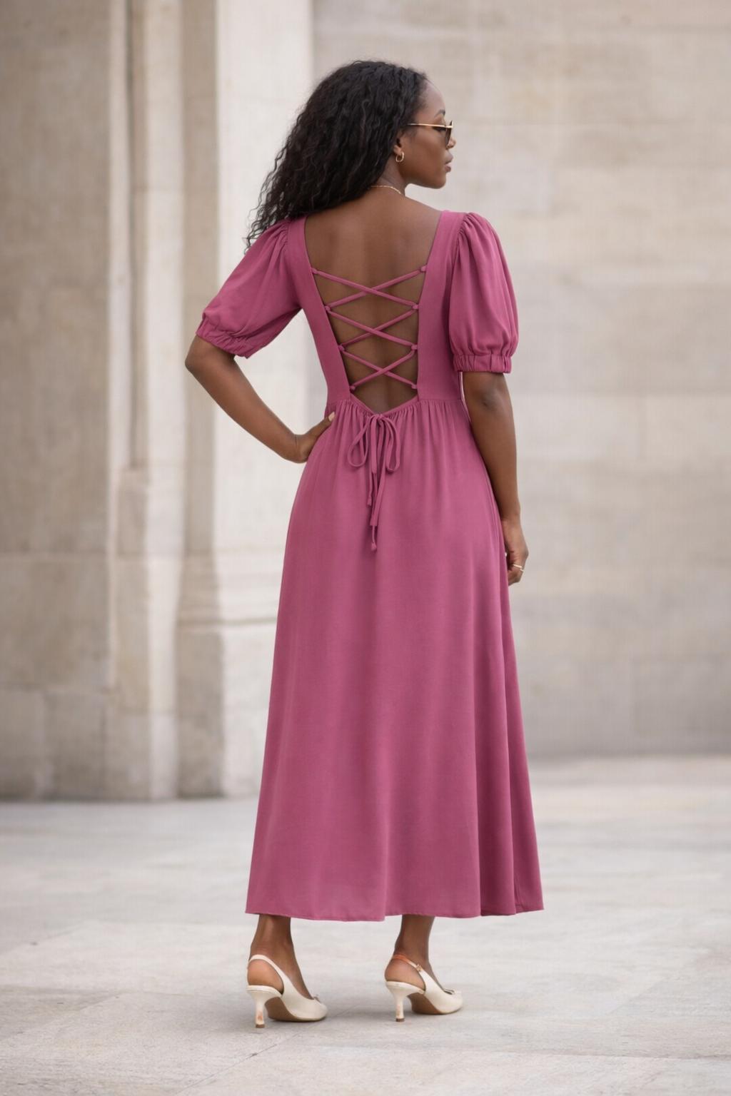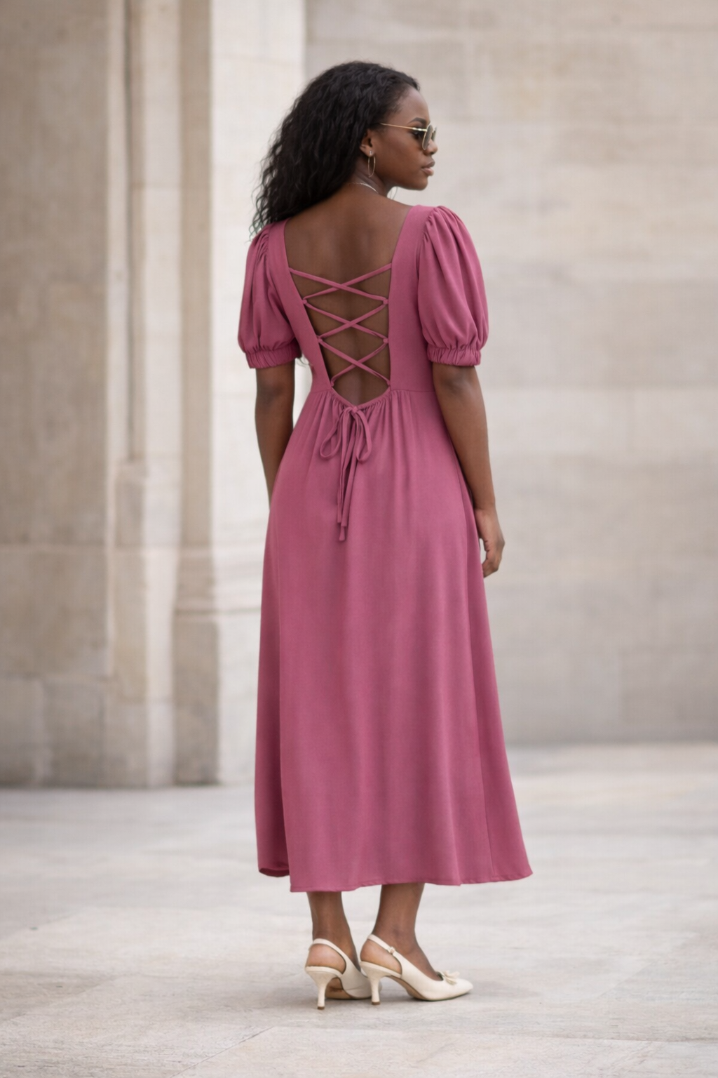 Une robe grande taille féminine et flatteuse, sublimée par un dos lacé plein d’allure.