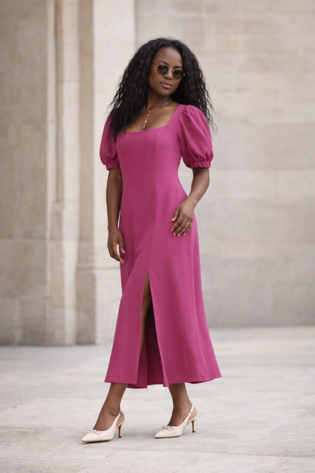 Cette robe grande taille séduit par sa ligne féminine et sa coupe élégamment structurée, pensée pour mettre la silhouette en valeur avec naturel. Son encolure carrée souligne joliment le haut du buste, tandis que ses manches courtes légèrement bouffantes apportent une touche romantique et raffinée, idéale pour la saison Printemps / Été.