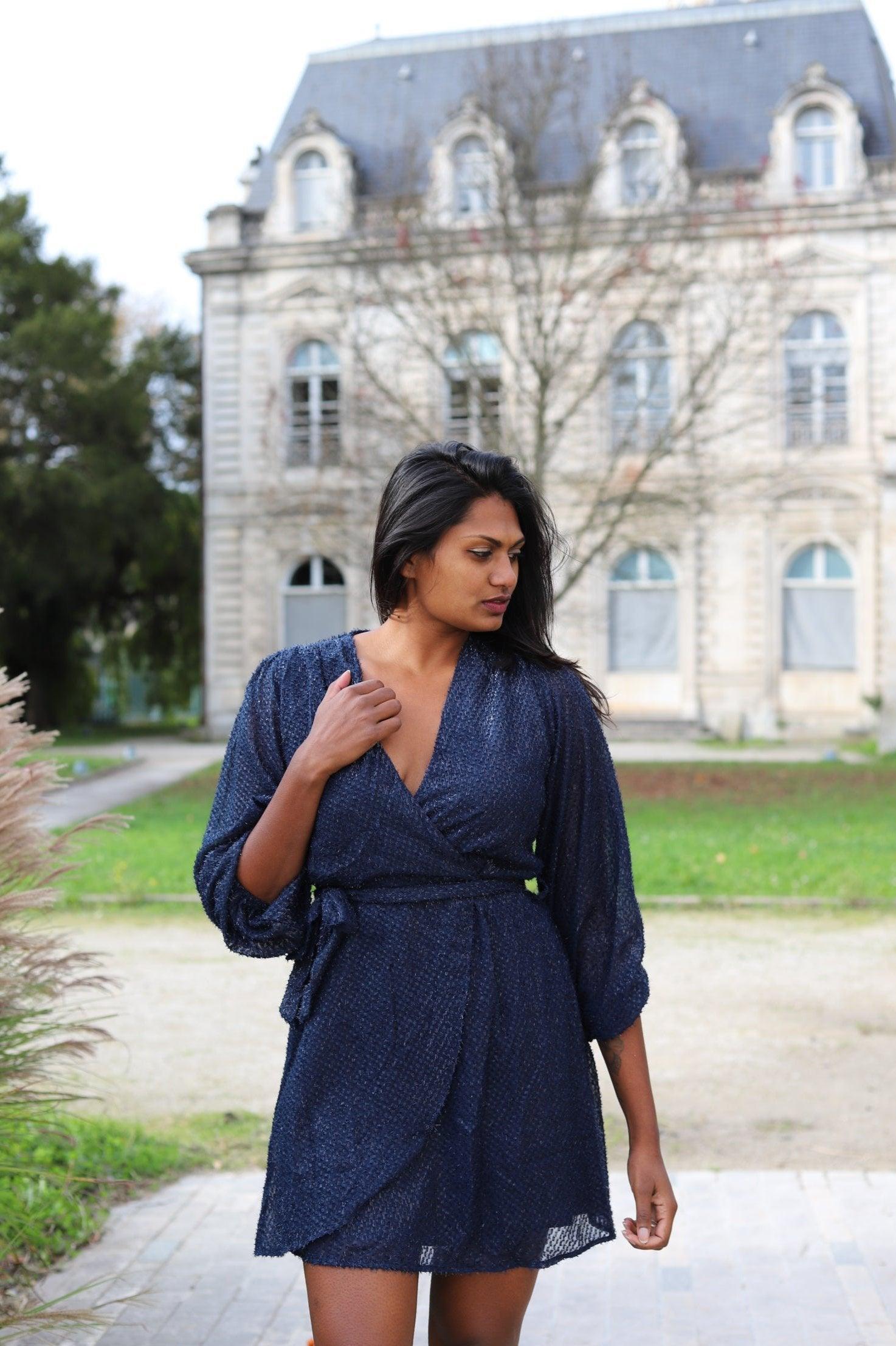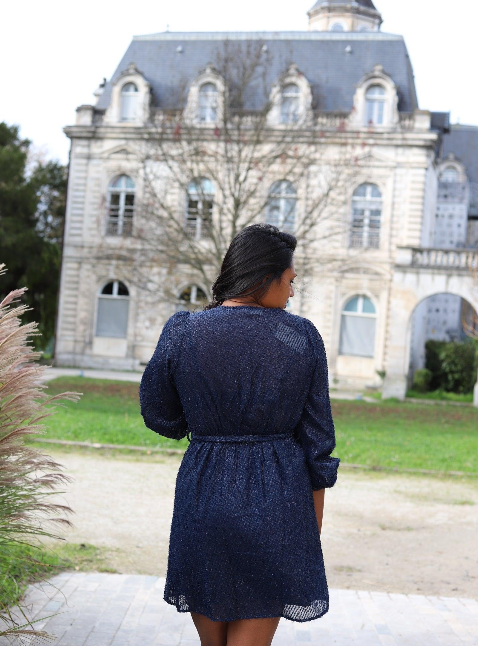 • Design : Robe bleu marine avec une texture élégante et scintillante.