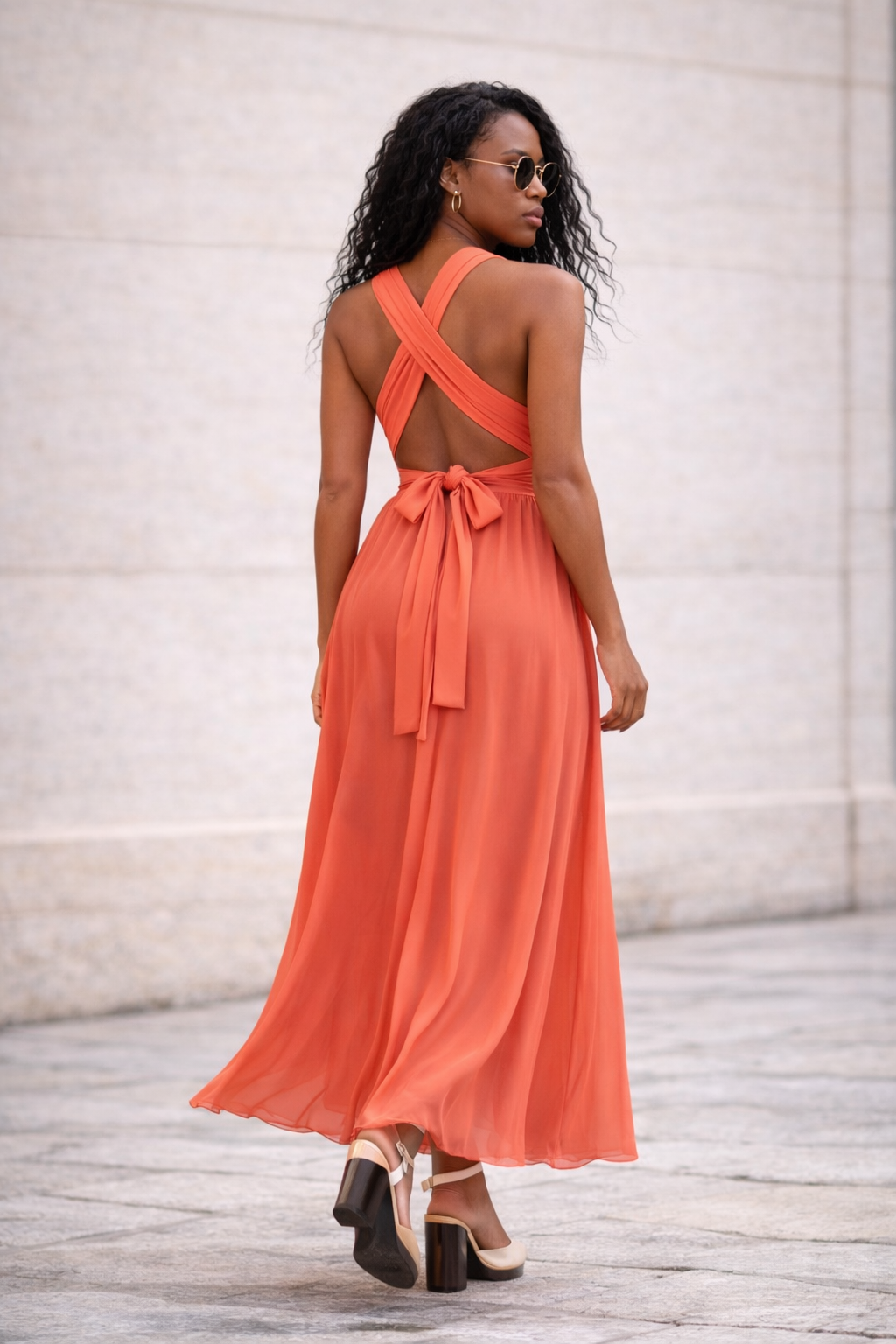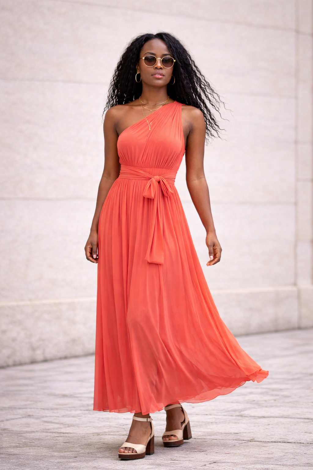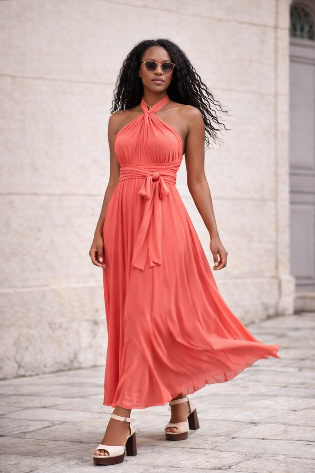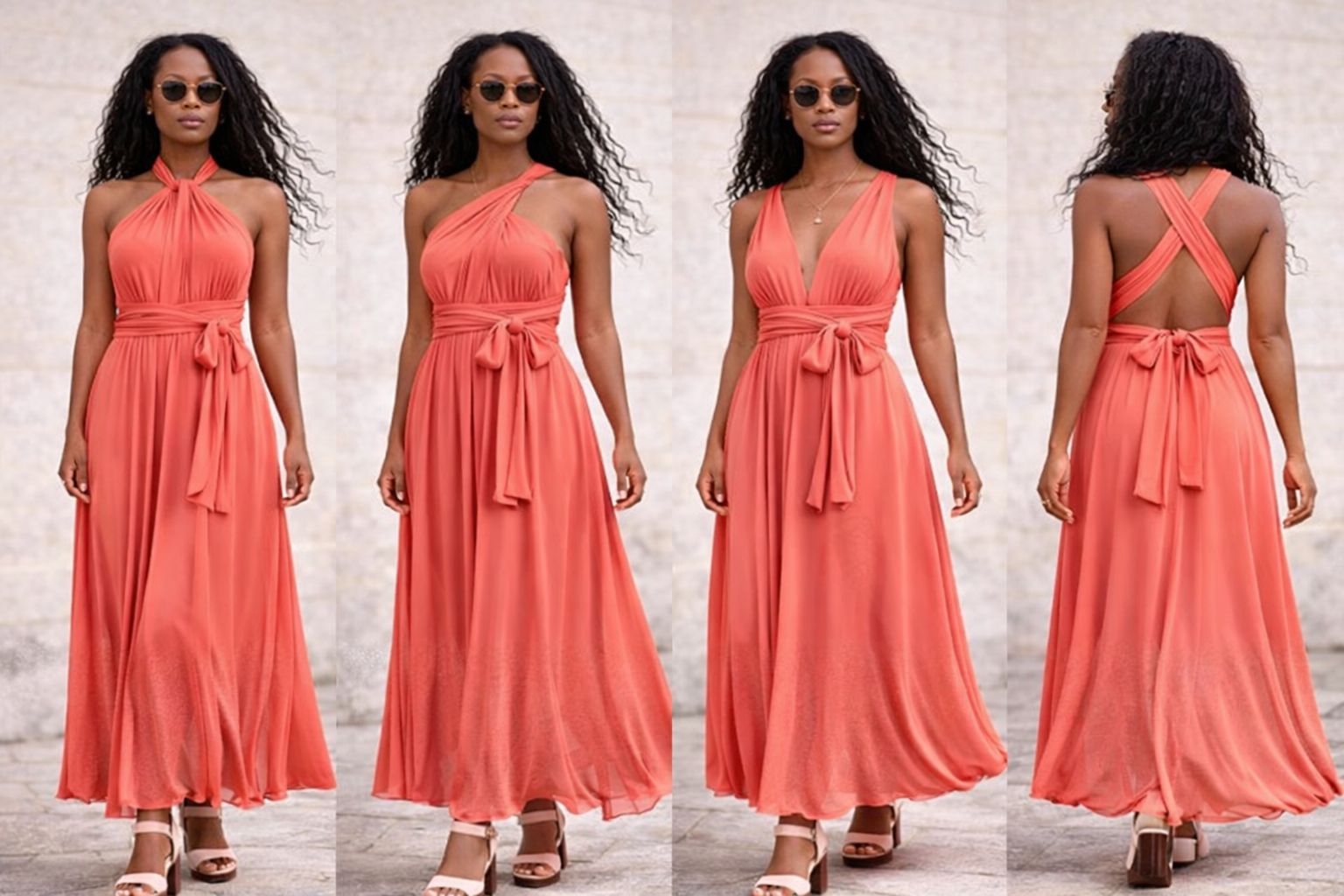 Cette robe longue corail est parfaite pour une cérémonie, un mariage, une soirée d’été, un cocktail ou une occasion spéciale. Portée avec des sandales à talon, des bijoux dorés et une pochette élégante, elle compose une silhouette glamour et sophistiquée.