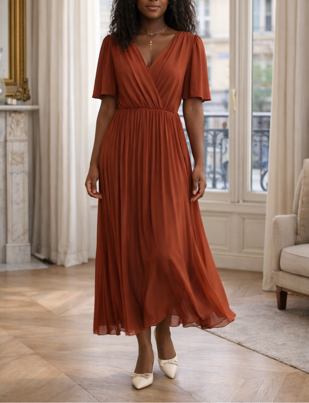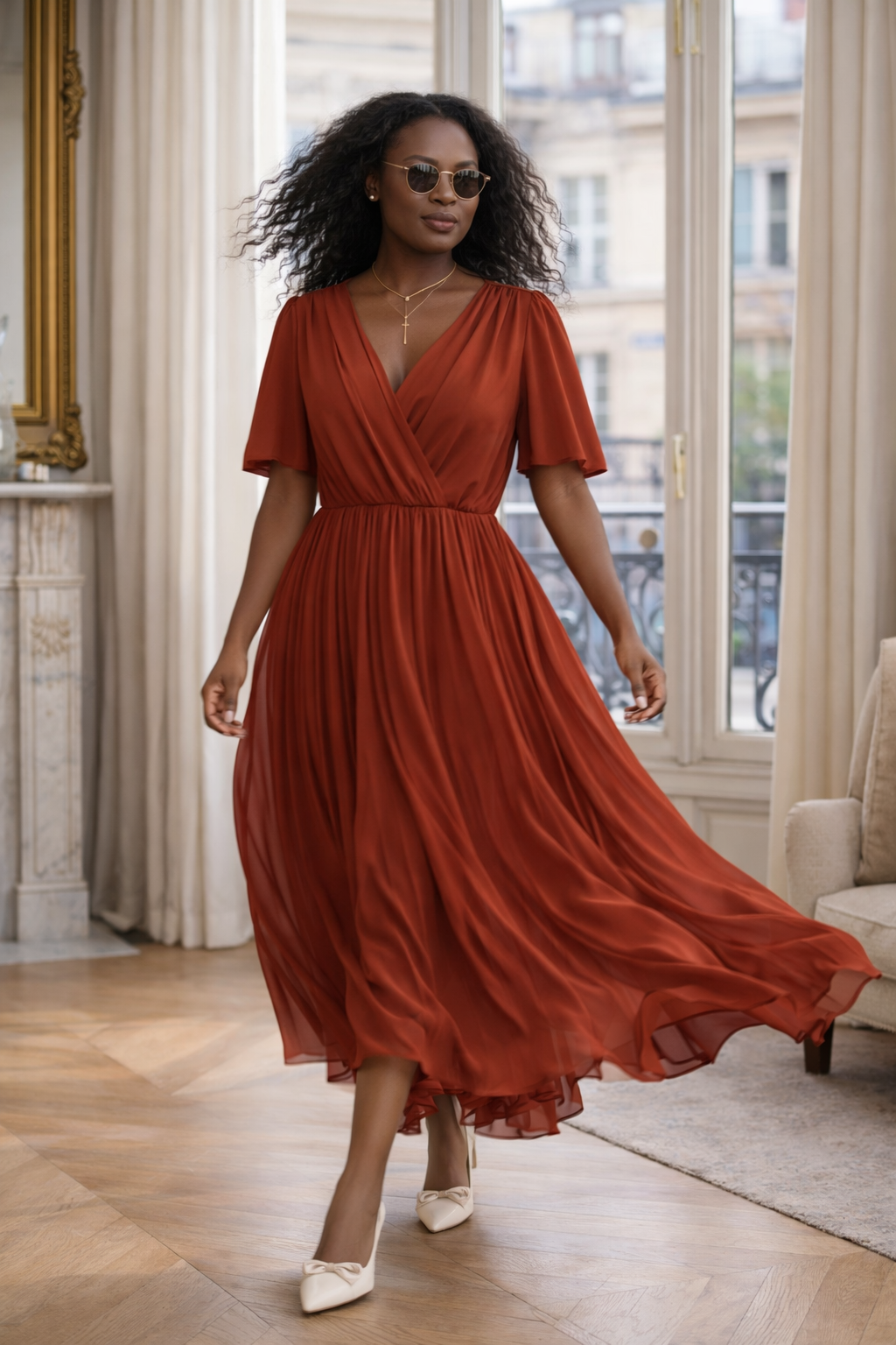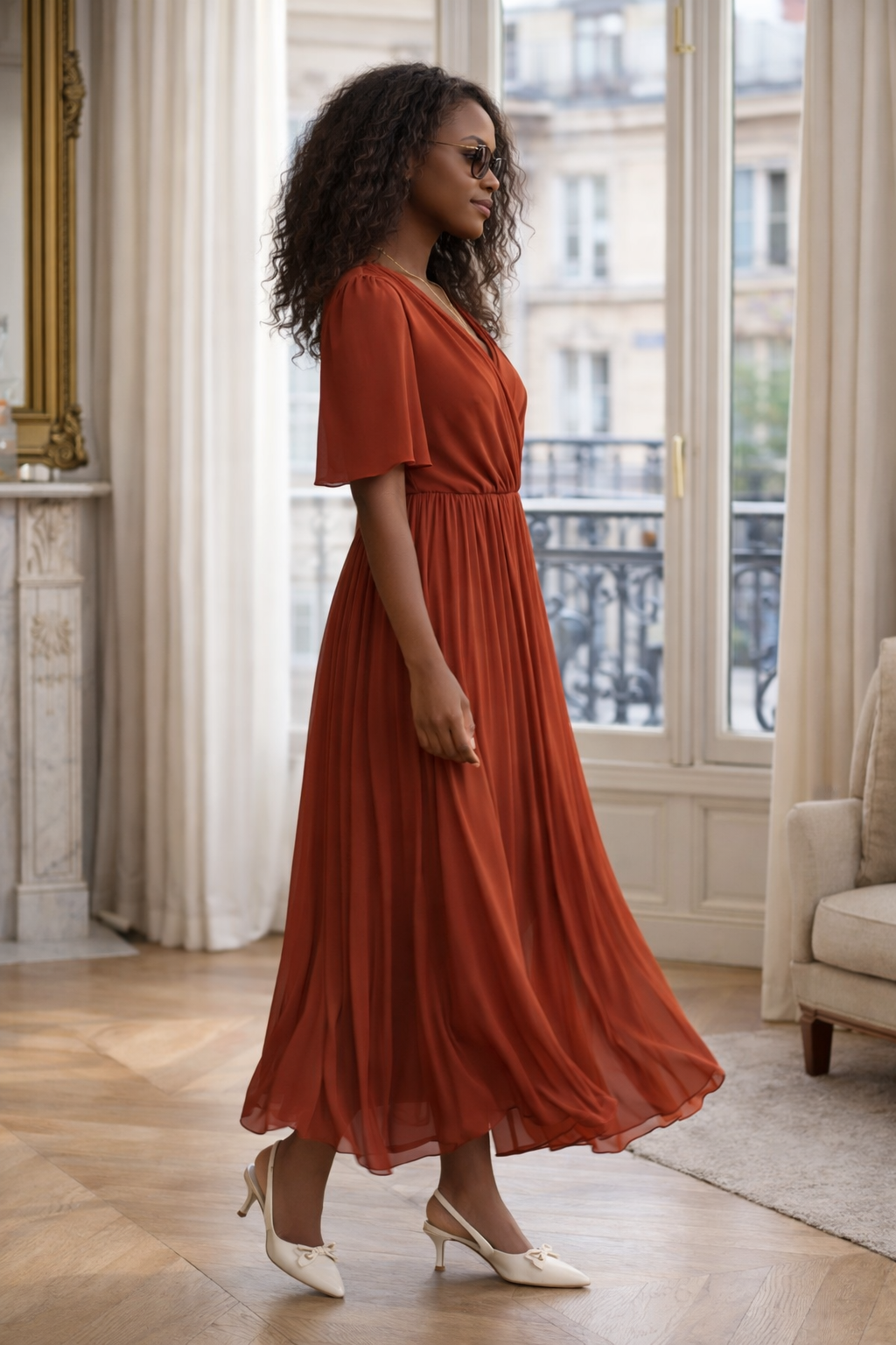 Cette robe longue terracotta est idéale pour une cérémonie, un mariage, un baptême, une soirée d’été ou un dîner élégant. Elle se porte facilement avec des sandales à talon, une pochette sobre et des bijoux dorés pour une silhouette lumineuse et raffinée.