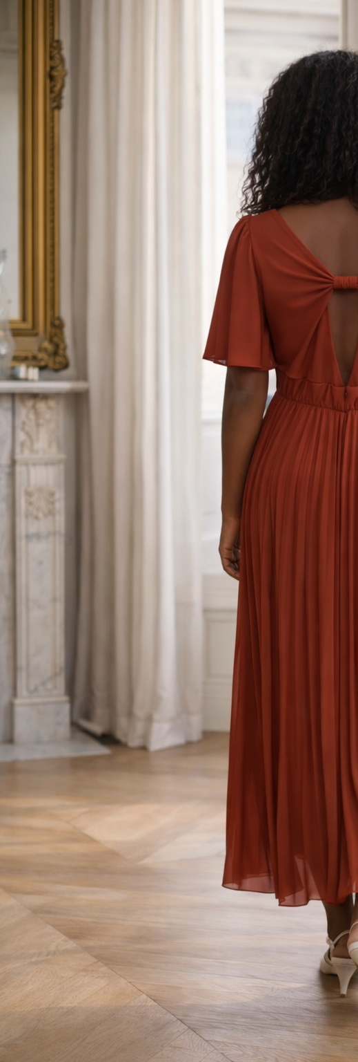 Cette robe longue terracotta séduit par sa ligne fluide, son tombé léger et son élégance naturelle. Féminine et raffinée, elle accompagne le mouvement avec douceur tout en mettant la silhouette en valeur grâce à sa coupe longue plissée et son coloris chaleureux, parfait pour la saison Printemps / Été.