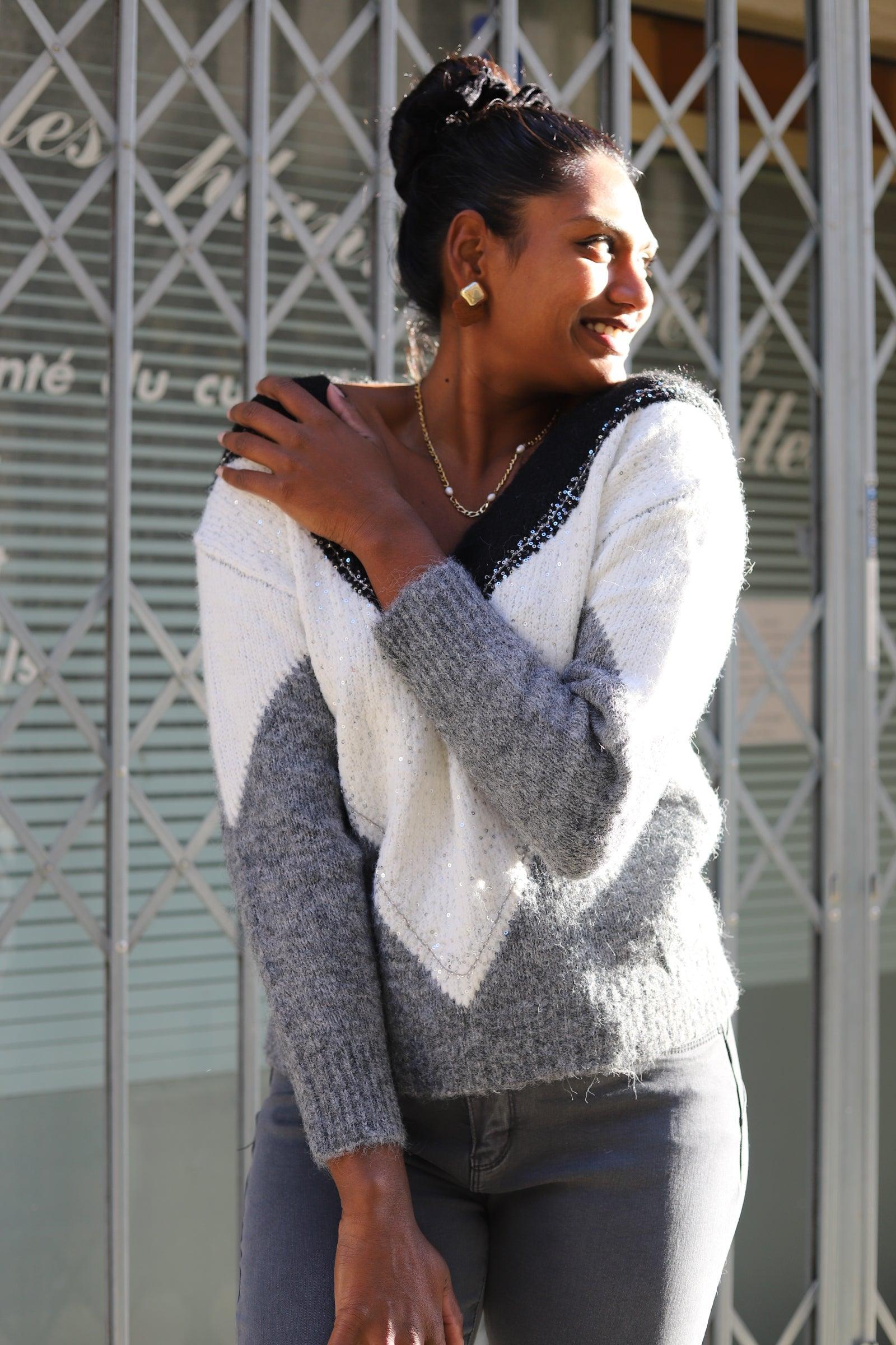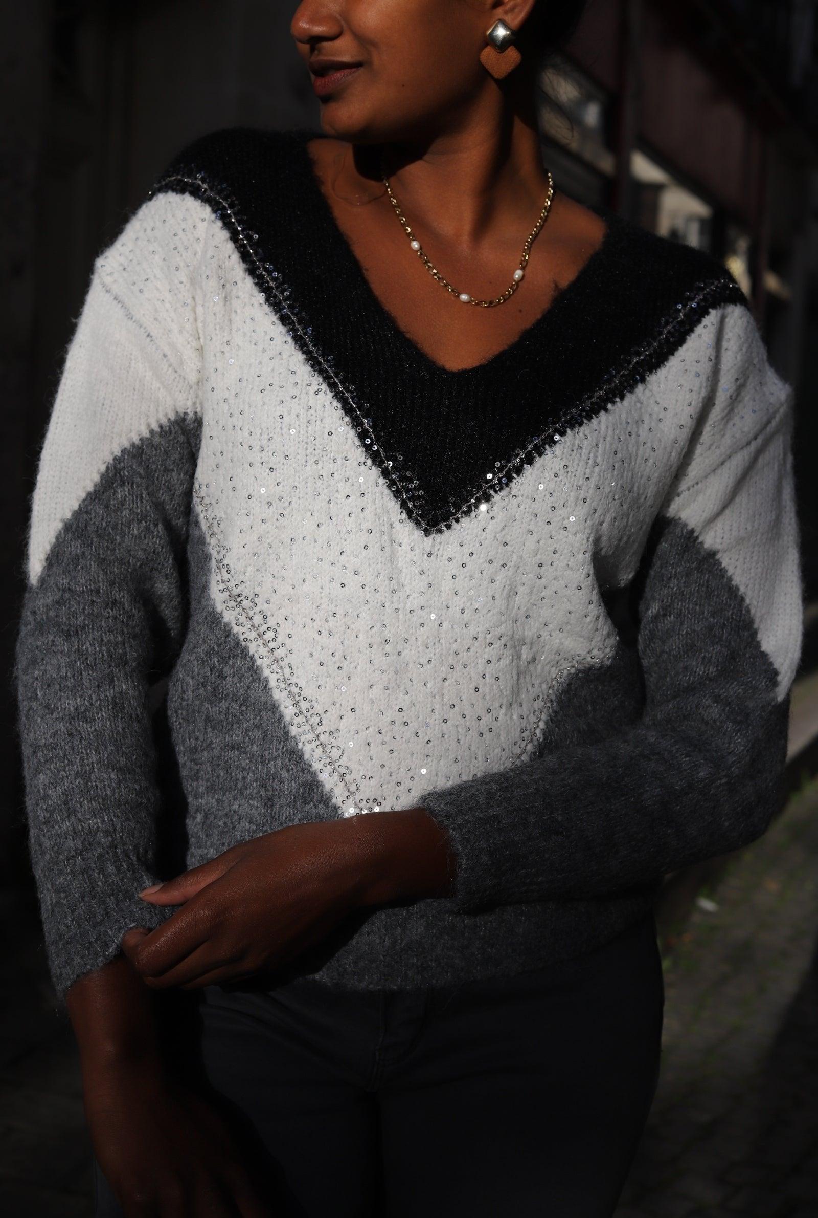 Pull Tricolore à Col V Profond avec Sequins – Chaleur et Style Éclatant