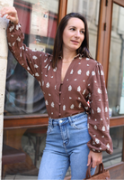 Affichez un look à la fois chic et bohème avec cette sublime chemise brodée en coton. On craque pour ses détails brodés blancs qui contrastent parfaitement avec le fond marron chocolat, et sa coupe romantique avec des manches bouffantes et un col volanté légèrement froncé. Une pièce coup de cœur pour l’automne, facile à associer avec un jean ou un pantalon taille haute.