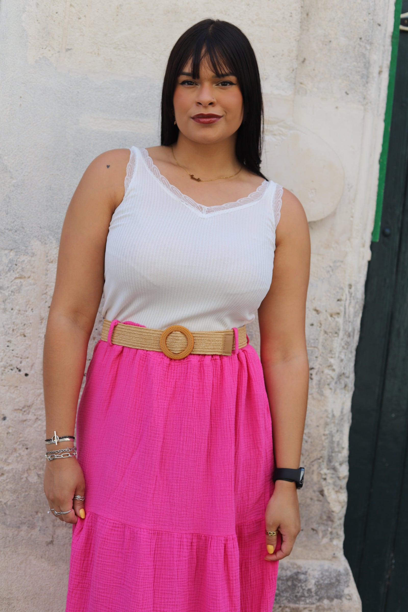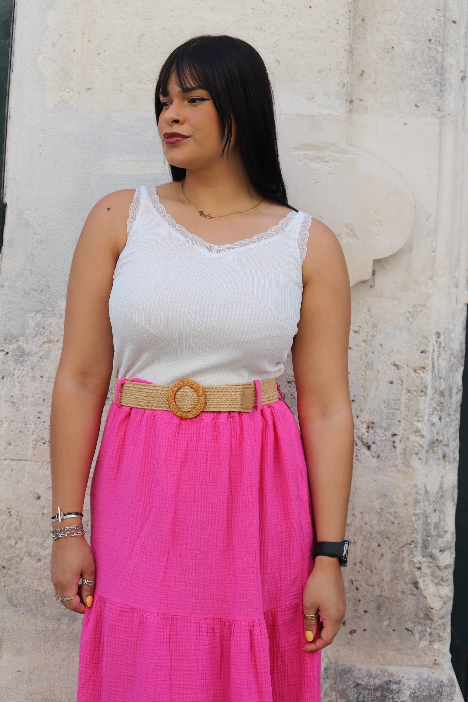Ce débardeur blanc côtelé est un indispensable du dressing féminin. Orné de délicate dentelle au col V et aux bretelles, il apporte une touche romantique à toutes vos tenues. Léger, extensible et agréable à porter, il s’adapte à toutes les morphologies grâce à sa taille unique.