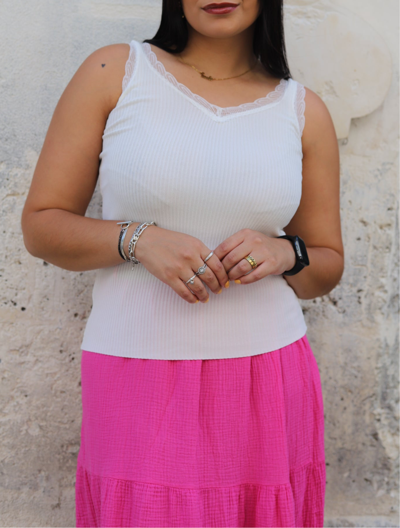 Débardeur côtelé blanc à dentelle – Élégance et confort au quotidien
