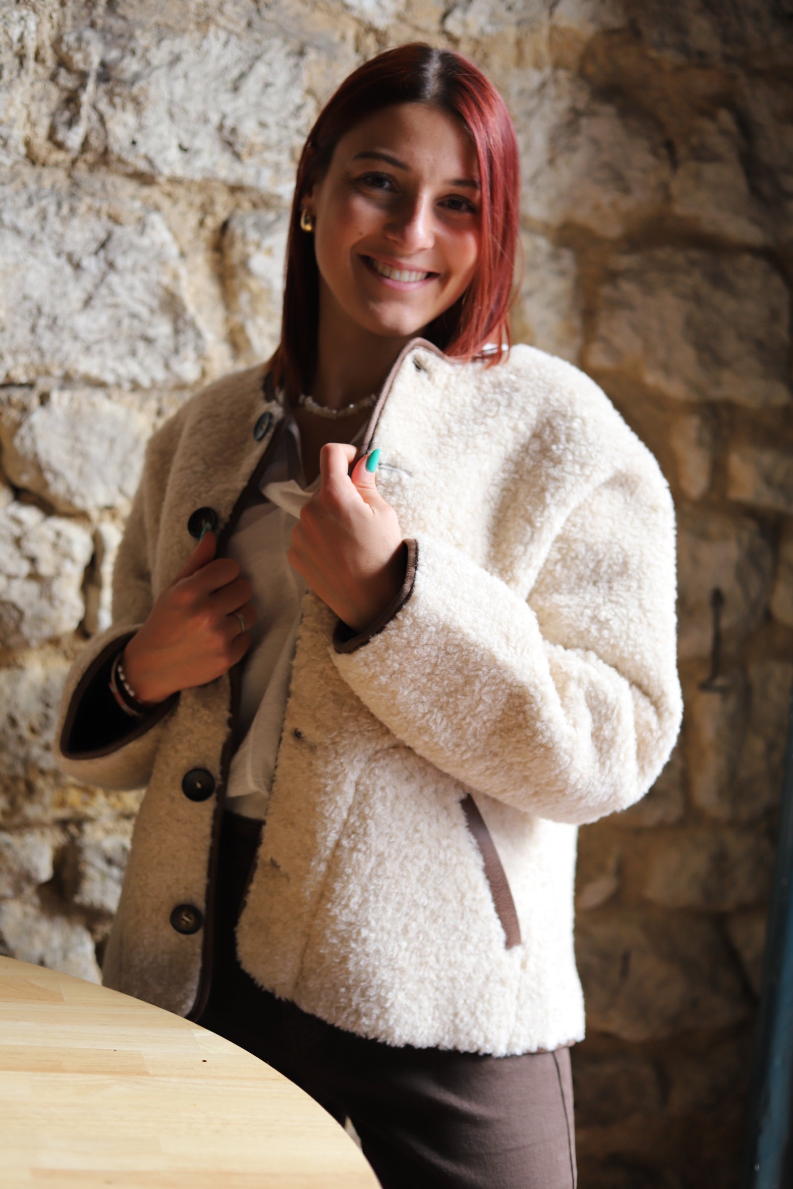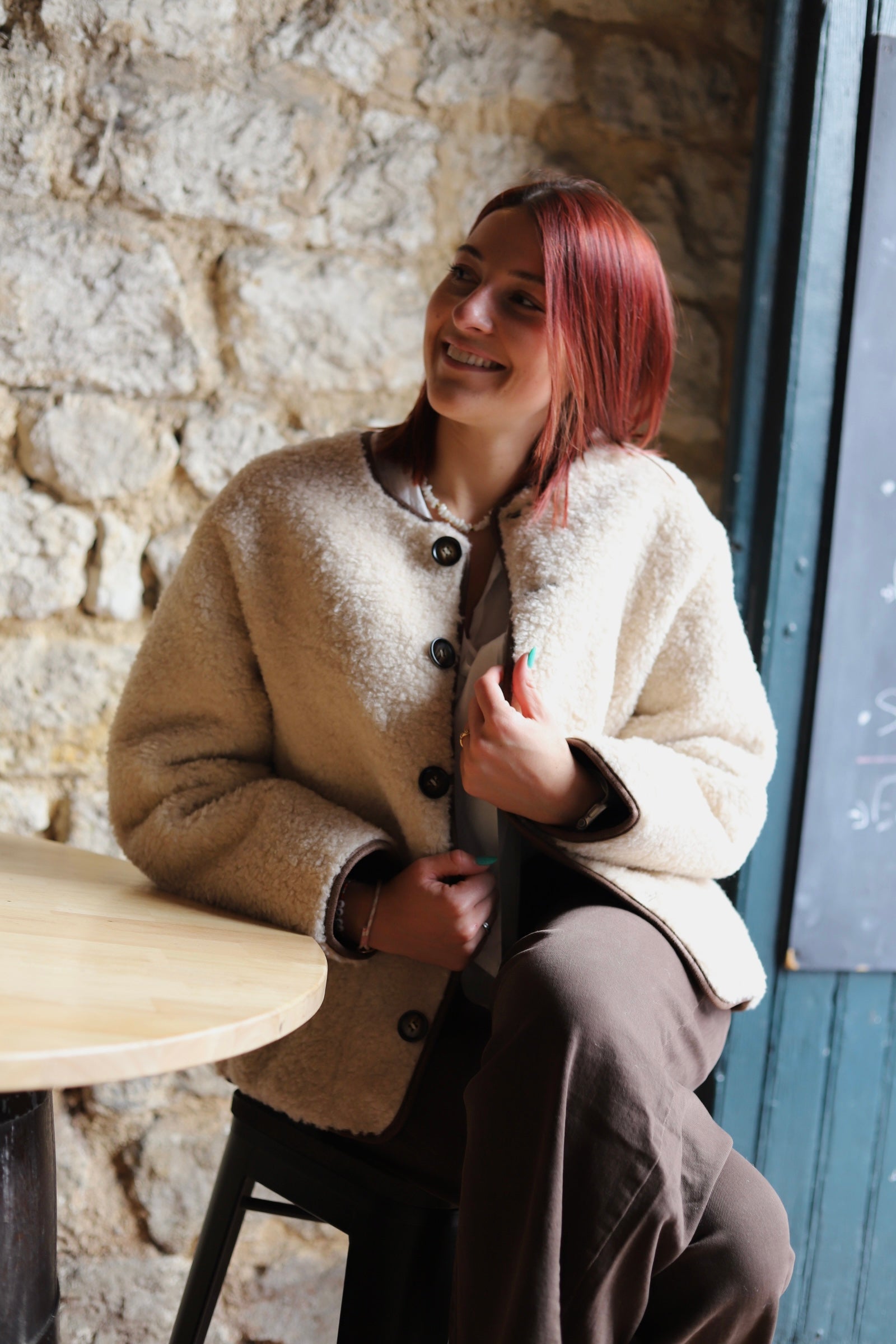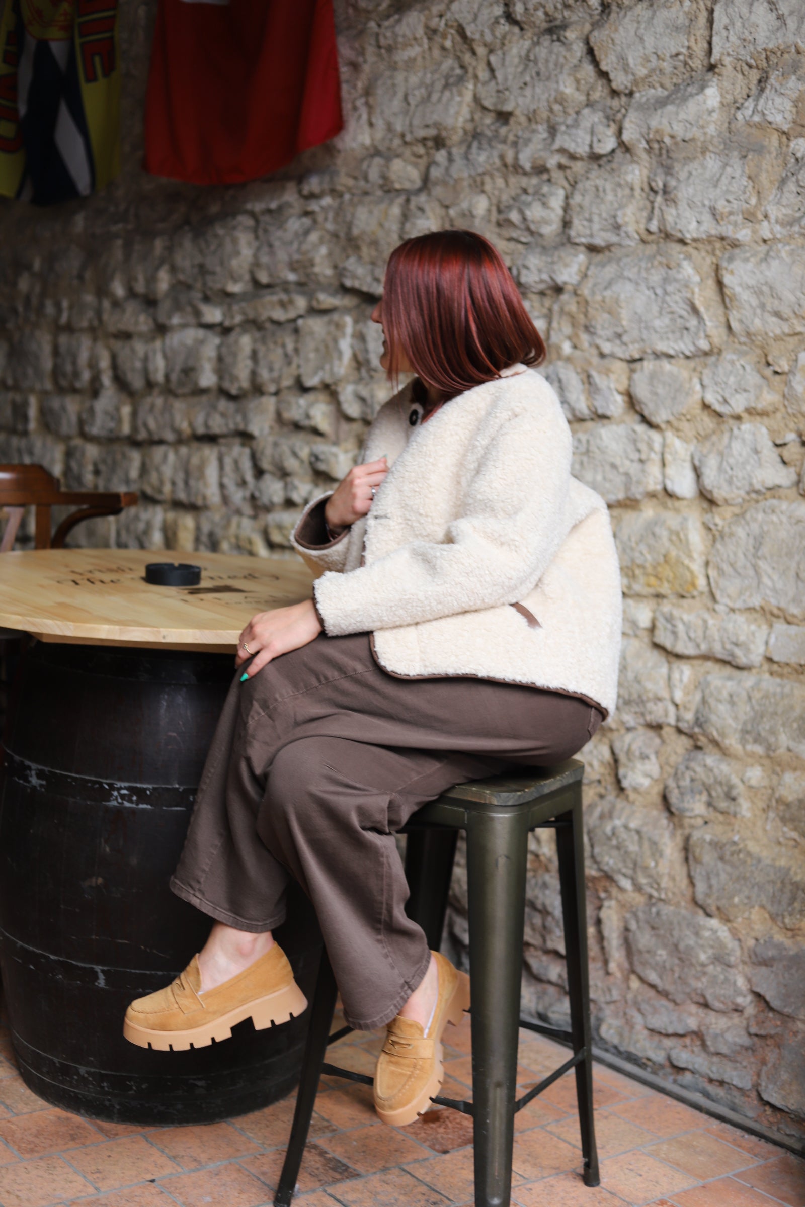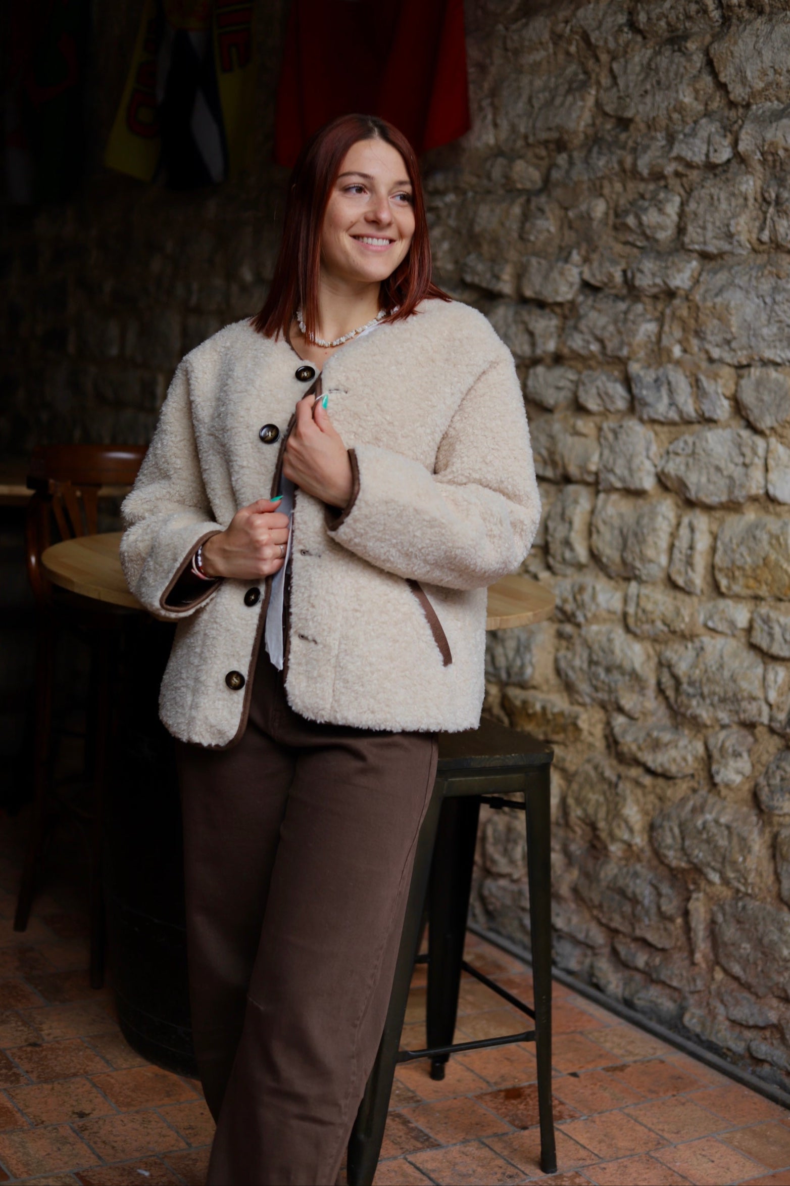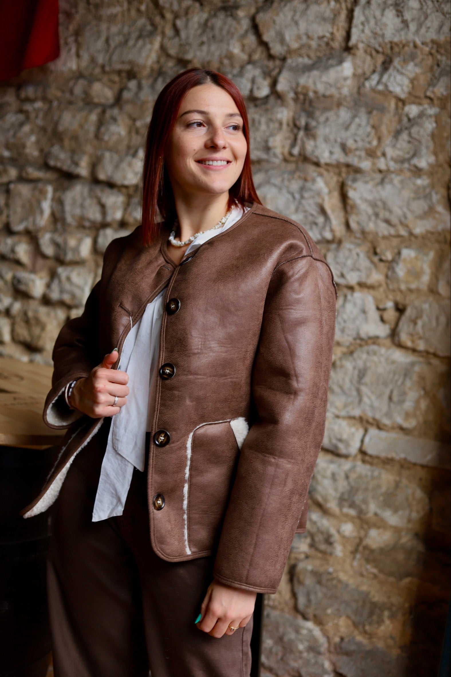 Craquez pour cette veste réversible ultra stylée qui s’adapte à toutes vos envies ! Côté pile, un effet cuir vieilli pour une allure urbaine chic ; côté face, une douce imitation mouton pour un look cocooning irrésistible. Avec sa coupe droite et ses boutons en bois, elle allie parfaitement confort et tendance.