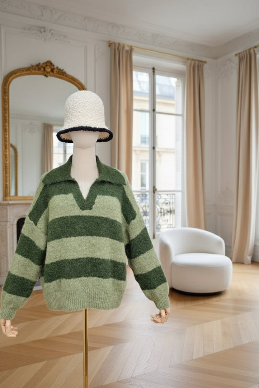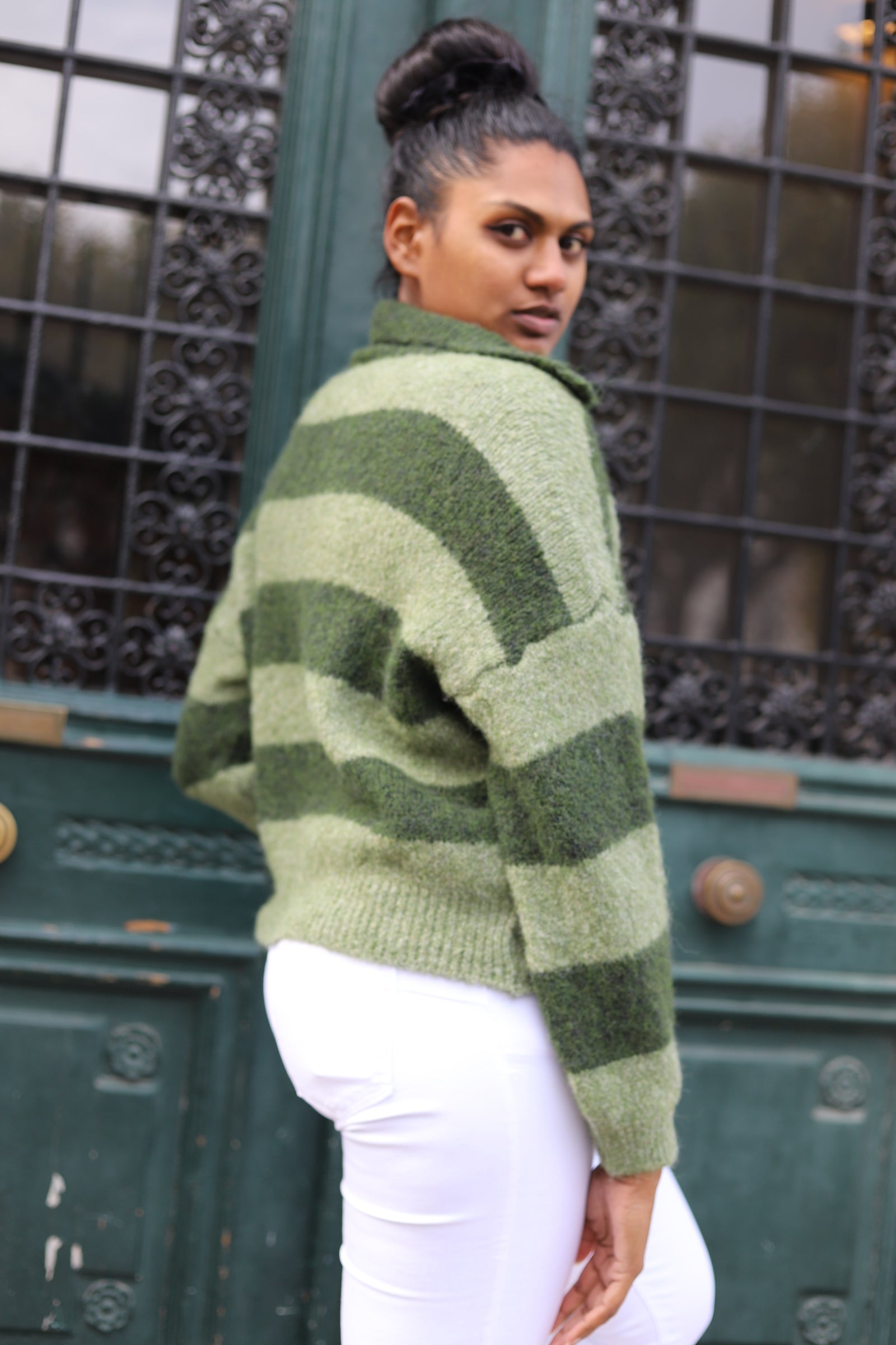 Pull Rayé Kaki à Col Chemise – Douceur & Style pour l’Hiver