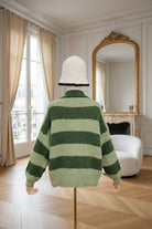 On craque pour ce pull à rayures larges dans des tons kaki ultra tendance ! Avec son col chemise et sa coupe loose, il offre un look casual chic parfait pour l’automne et l’hiver. Une pièce confortable, chaude et stylée à enfiler sans réfléchir 💚